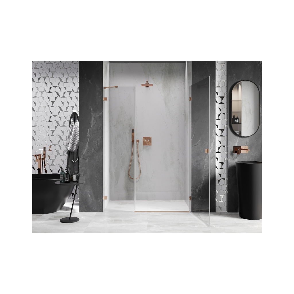 V konfiguraci více rozměrů nabízí stabilní konstrukci a výklopné (křídlové) dveře. Tvrzené sklo s povrchem EasyClean usnadňuje údržbu a profil v odstínu Broušená měď zapadne do moderních koupelen.