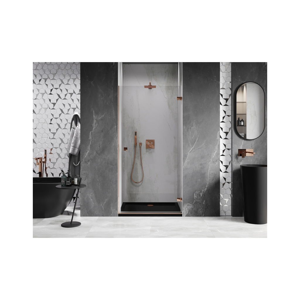 V konfiguraci více rozměrů nabízí stabilní konstrukci a výklopné (křídlové) dveře. Tvrzené sklo s povrchem EasyClean usnadňuje údržbu a profil v odstínu Růžové zlato zapadne do moderních koupelen.