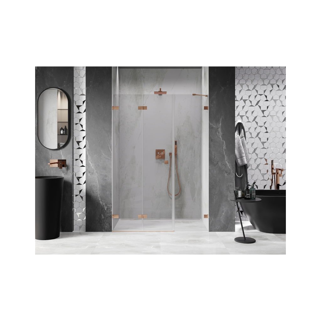 V konfiguraci více rozměrů nabízí stabilní konstrukci a skládací dveře. Tvrzené sklo s povrchem EasyClean usnadňuje údržbu a profil v odstínu Broušená měď zapadne do moderních koupelen.
