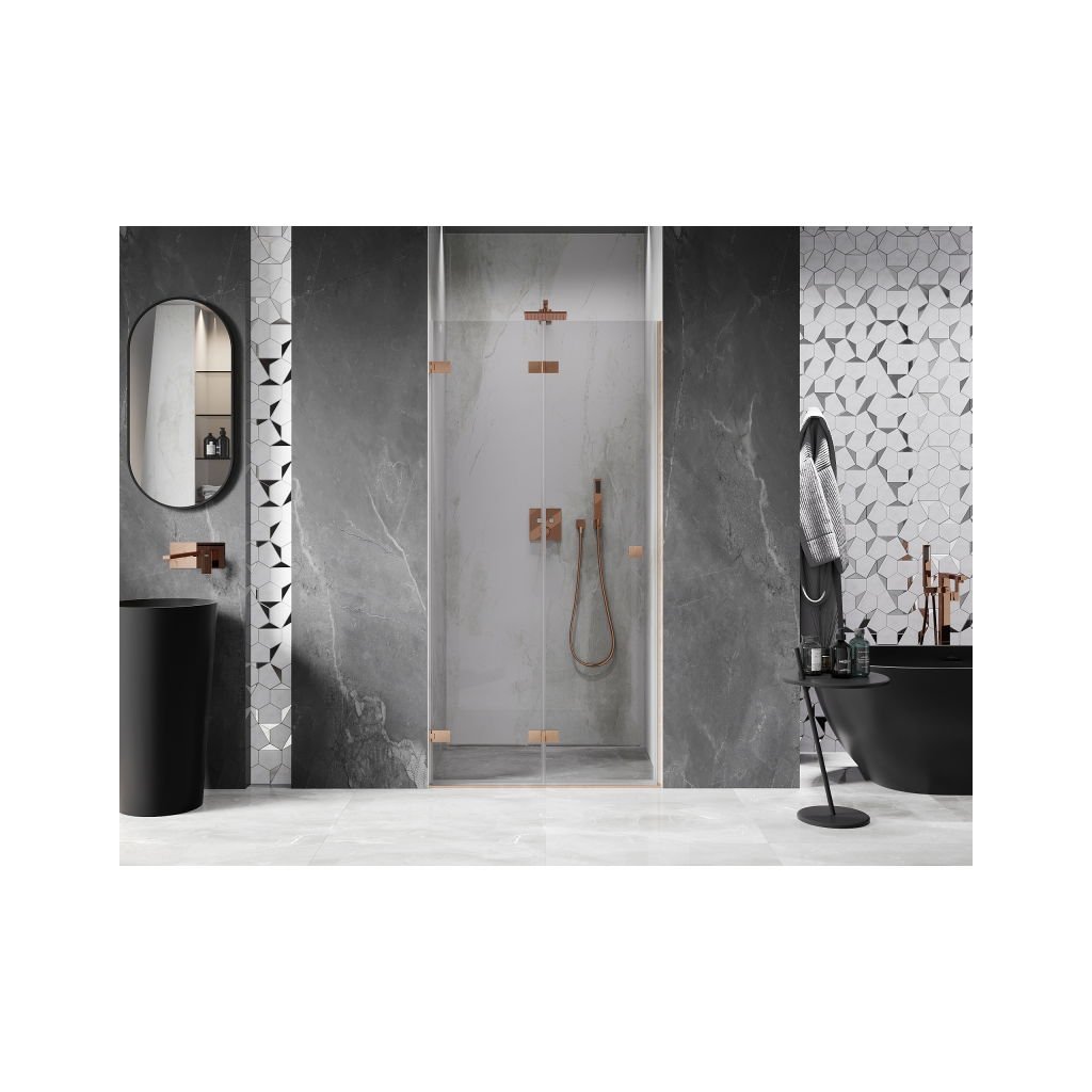 V konfiguraci více rozměrů nabízí stabilní konstrukci a skládací dveře. Tvrzené sklo s povrchem EasyClean usnadňuje údržbu a profil v odstínu Broušená měď zapadne do moderních koupelen.