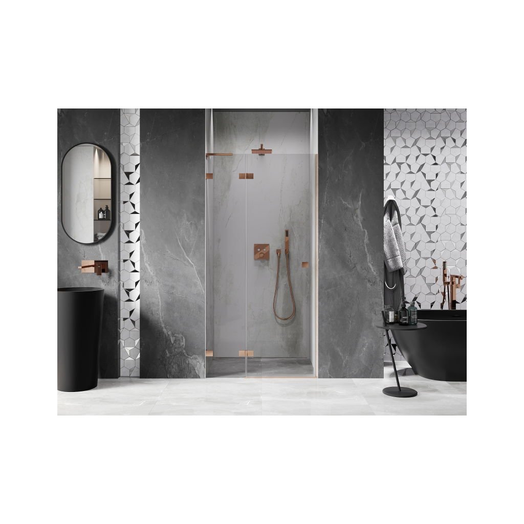 V konfiguraci více rozměrů nabízí stabilní konstrukci a výklopné (křídlové) dveře. Tvrzené sklo s povrchem EasyClean usnadňuje údržbu a profil v odstínu Broušená měď zapadne do moderních koupelen.
