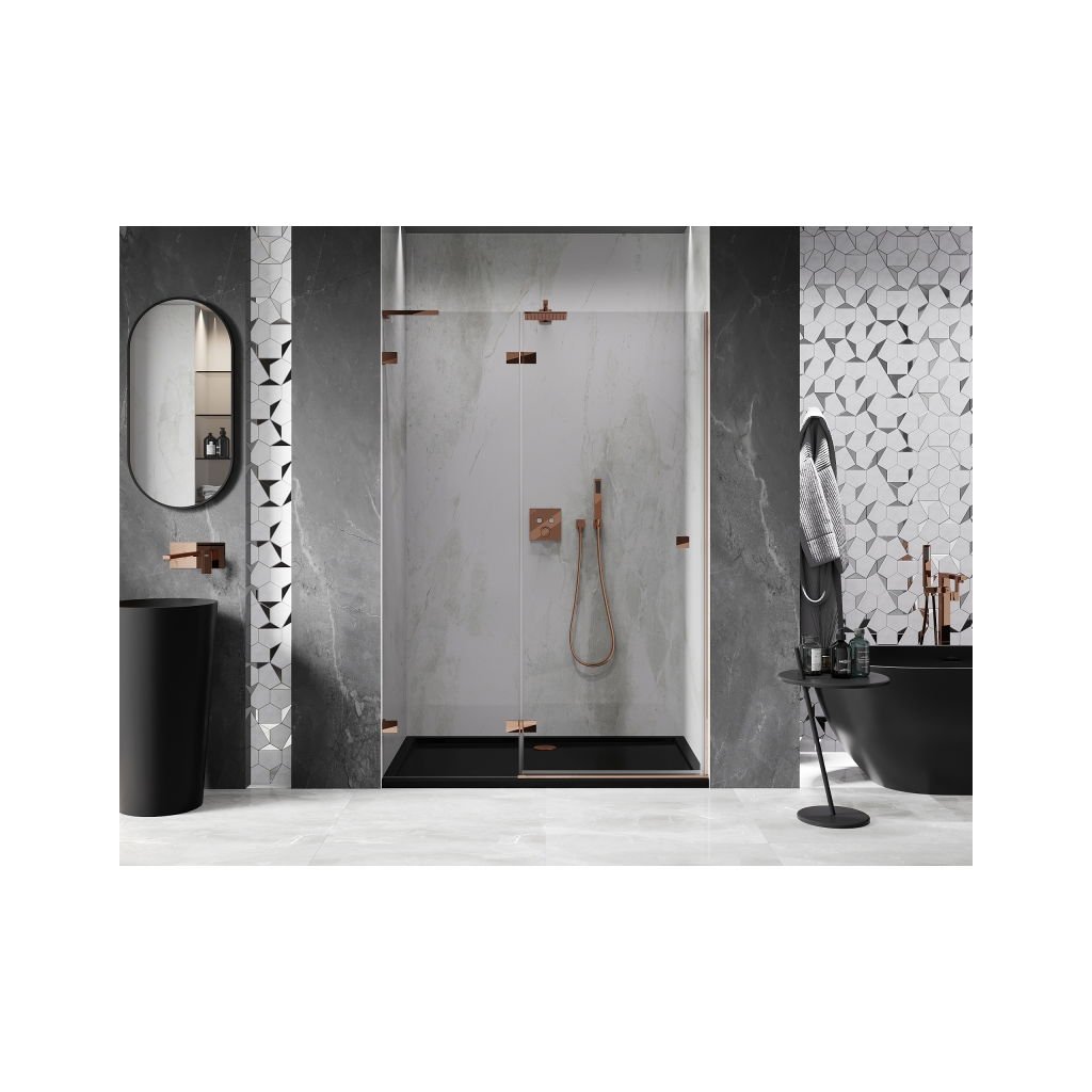 V konfiguraci více rozměrů nabízí stabilní konstrukci a výklopné (křídlové) dveře. Tvrzené sklo s povrchem EasyClean usnadňuje údržbu a profil v odstínu Růžové zlato zapadne do moderních koupelen.