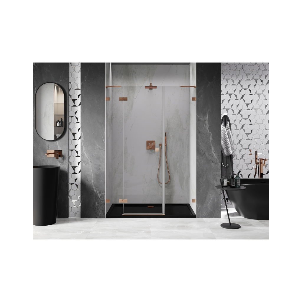 V konfiguraci více rozměrů nabízí stabilní konstrukci a výklopné (křídlové) dveře. Tvrzené sklo s povrchem EasyClean usnadňuje údržbu a profil v odstínu Broušená měď zapadne do moderních koupelen.