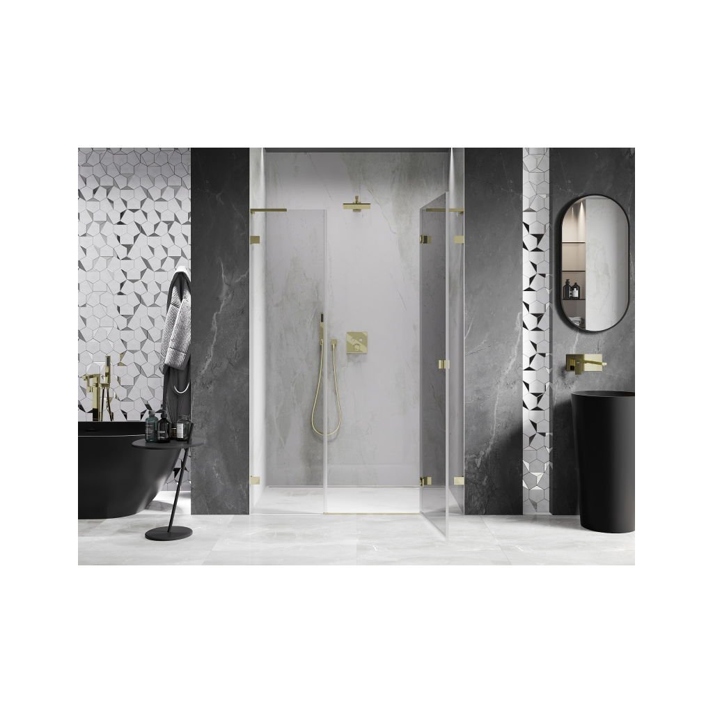 V konfiguraci více rozměrů nabízí stabilní konstrukci a výklopné (křídlové) dveře. Tvrzené sklo s povrchem EasyClean usnadňuje údržbu a profil v odstínu Zlatá lesklá zapadne do moderních koupelen.