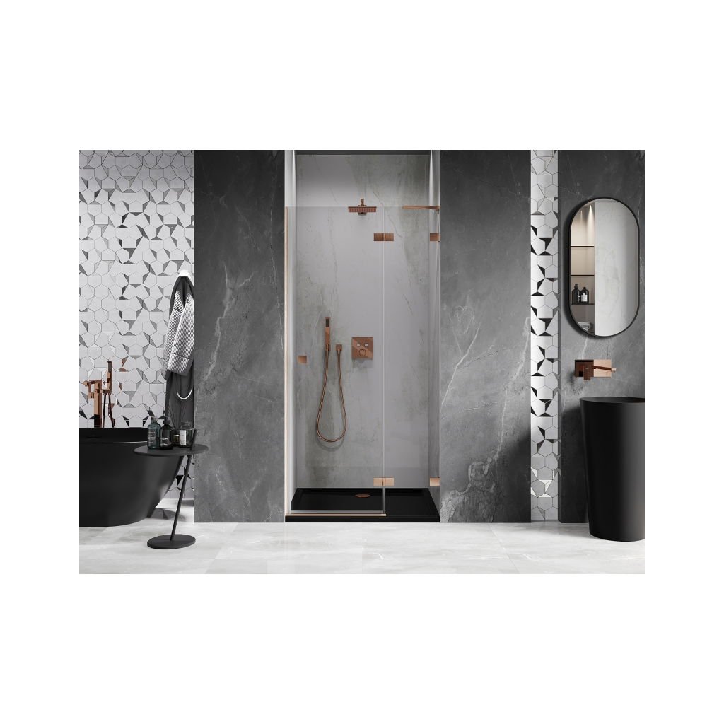 V konfiguraci více rozměrů nabízí stabilní konstrukci a výklopné (křídlové) dveře. Tvrzené sklo s povrchem EasyClean usnadňuje údržbu a profil v odstínu Broušená měď zapadne do moderních koupelen.