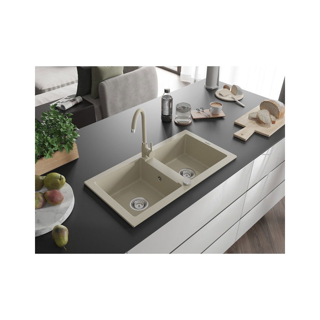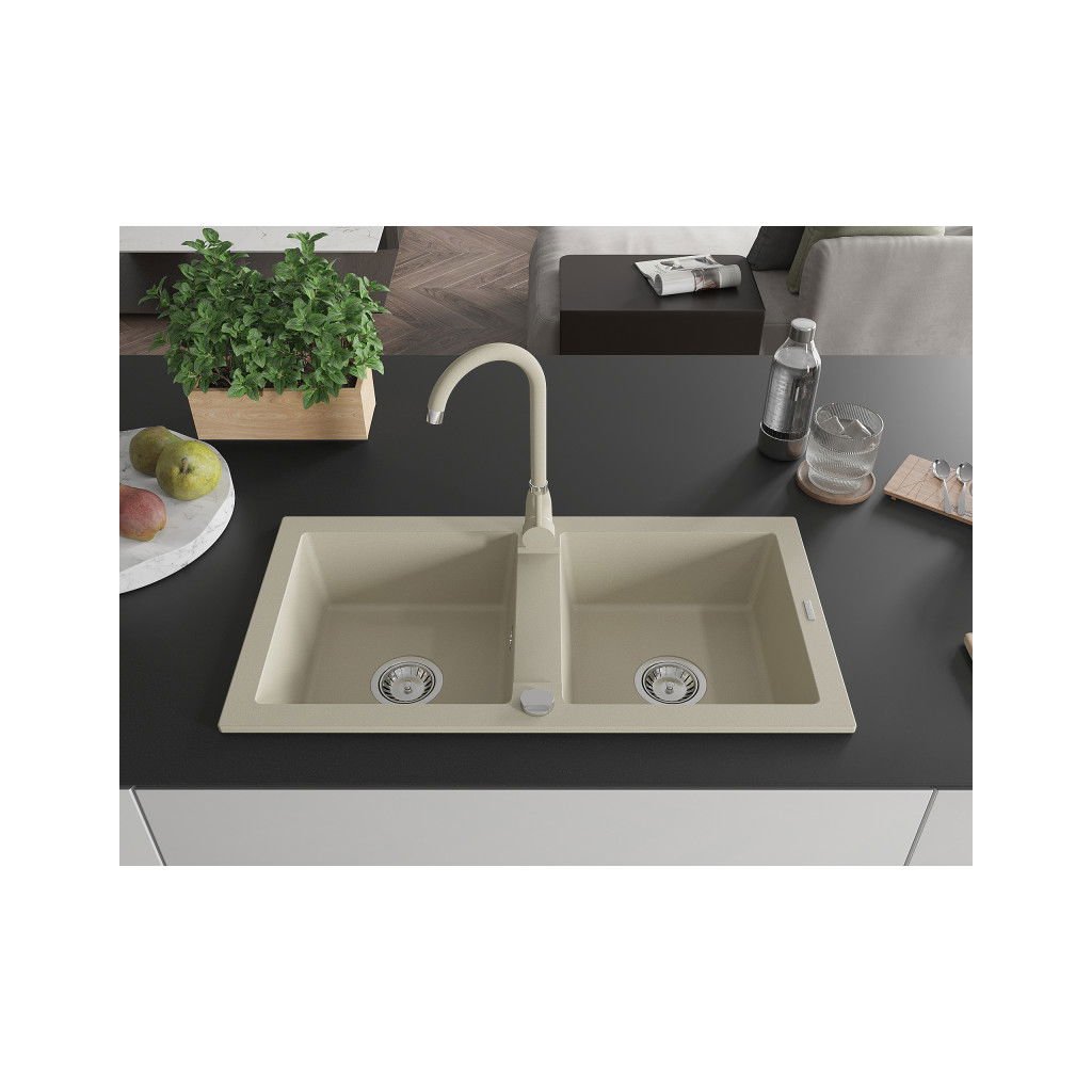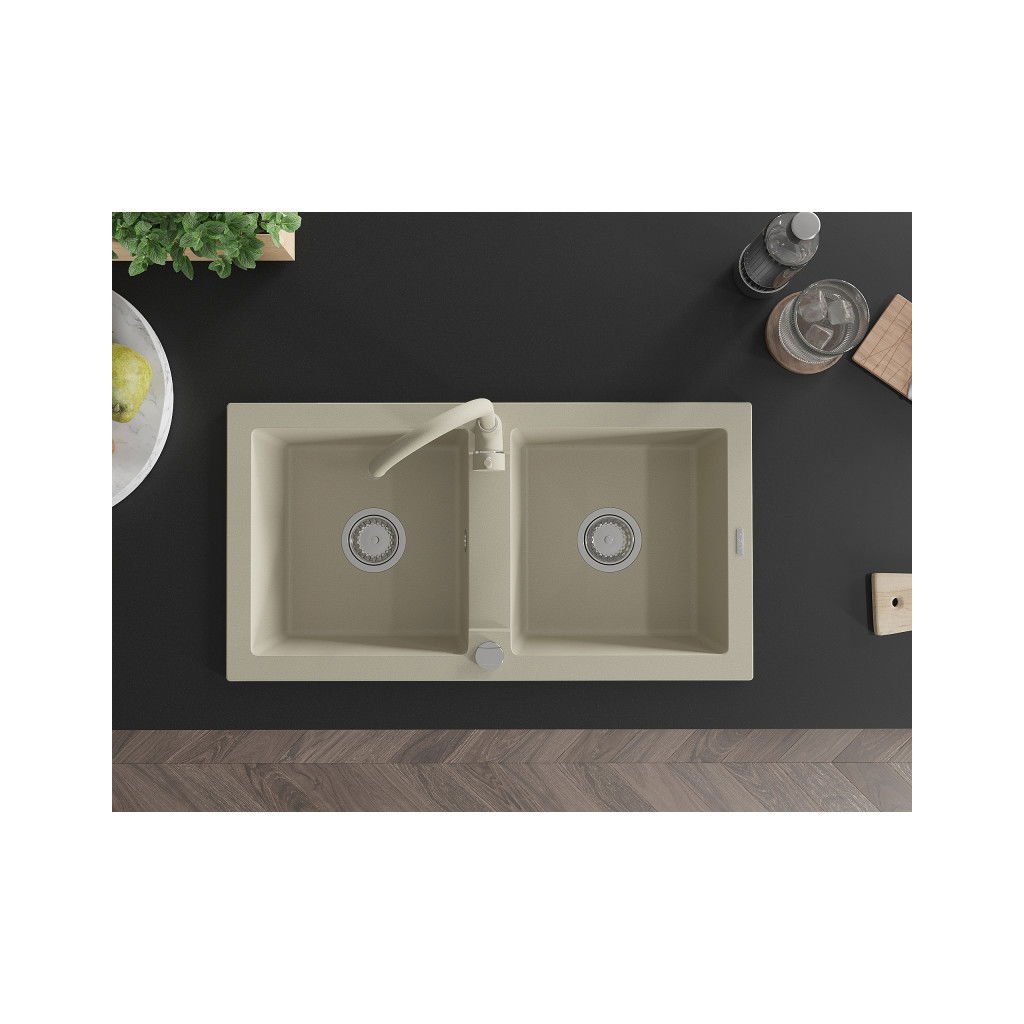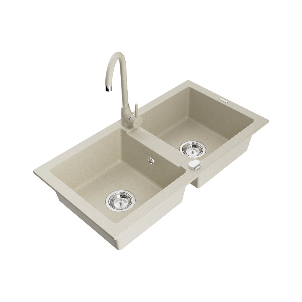 Mexen Mario, 2-komorový granitový dřez 82x44 cm s kuchyňskou baterií Telma, béžová, 6504-69-670200-69