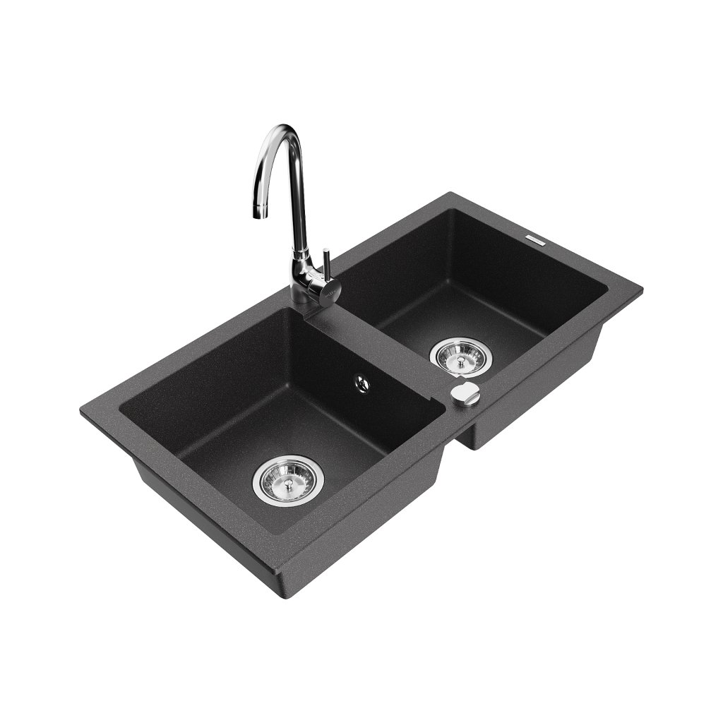 Mexen Mario, 2-komorový granitový dřez 82x44 cm s kuchyňskou baterií Telma, černá-skvrnitá, 6504-76-670200-00