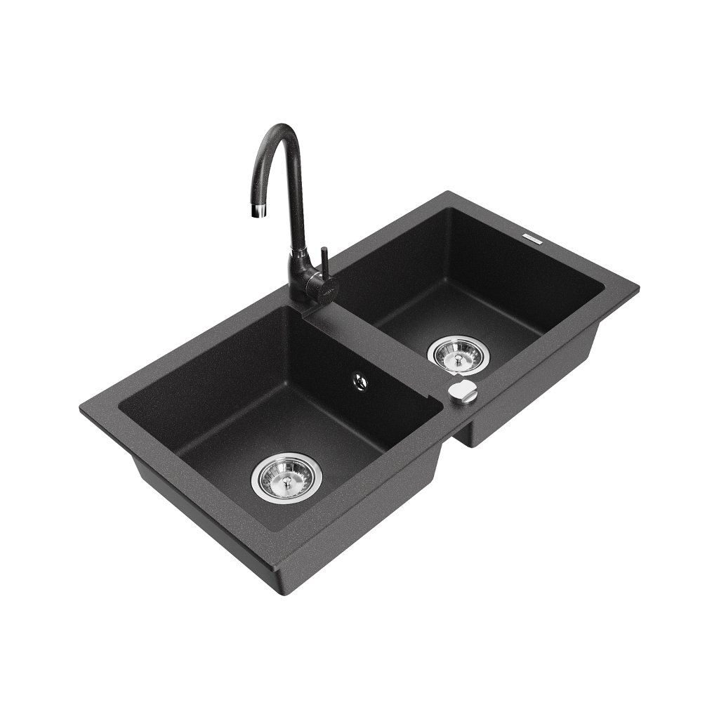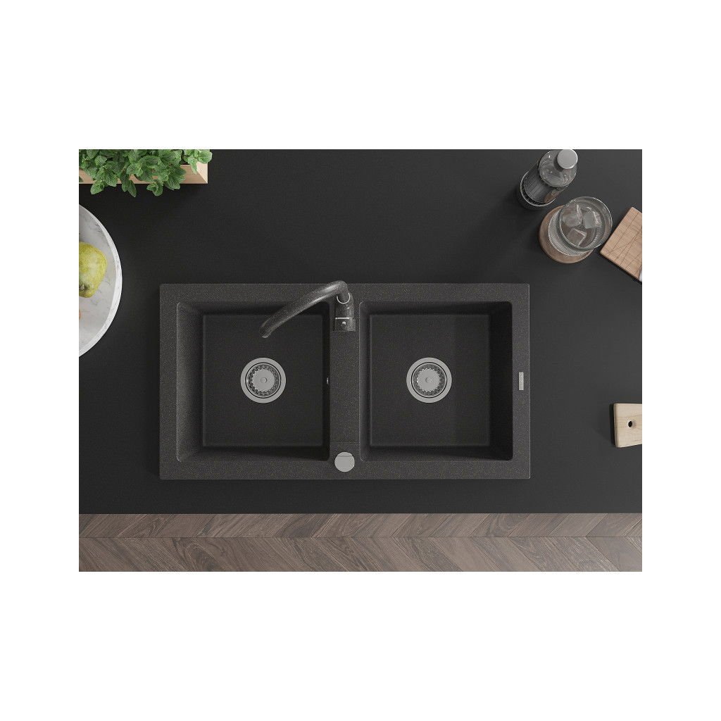 Mexen Mario, 2-komorový granitový dřez 82x44 cm s kuchyňskou baterií Telma, černá-skvrnitá, 6504-76-670200-76