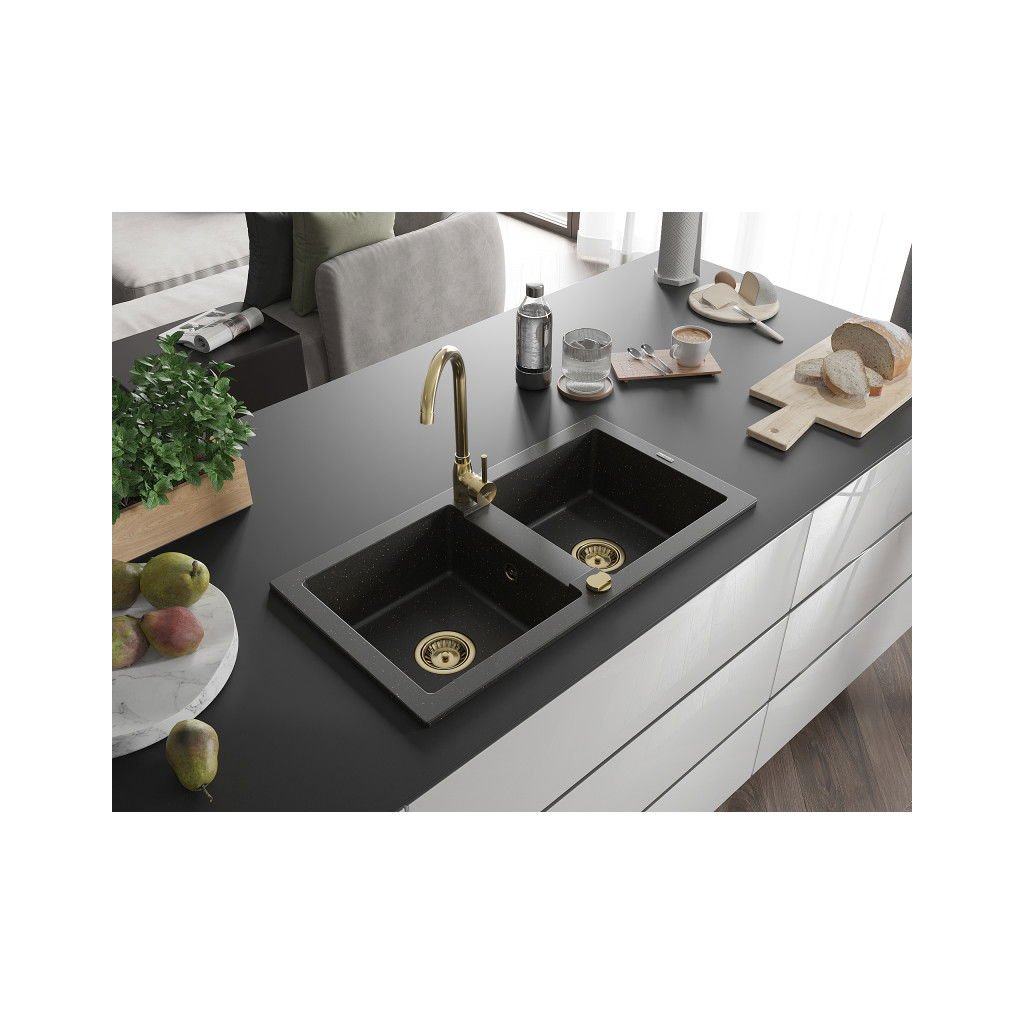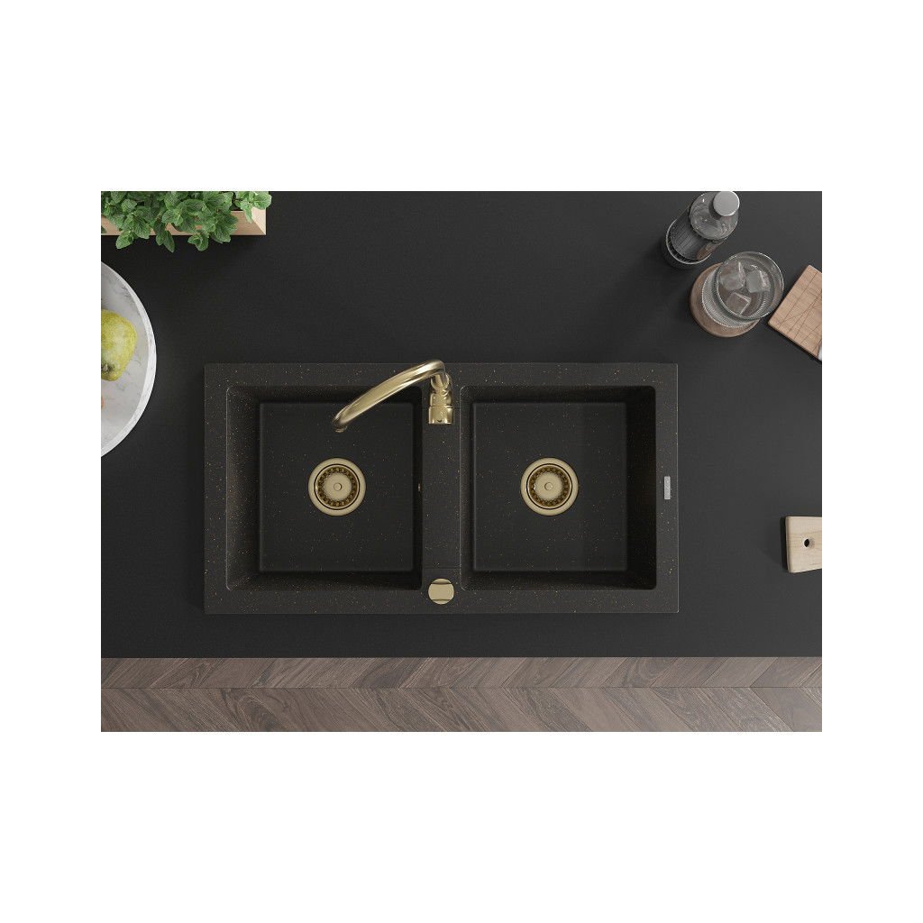 Mexen Mario, 2-komorový granitový dřez 82x44 cm s kuchyňskou baterií Telma, černá-zlatá, 6504-75-670200-50