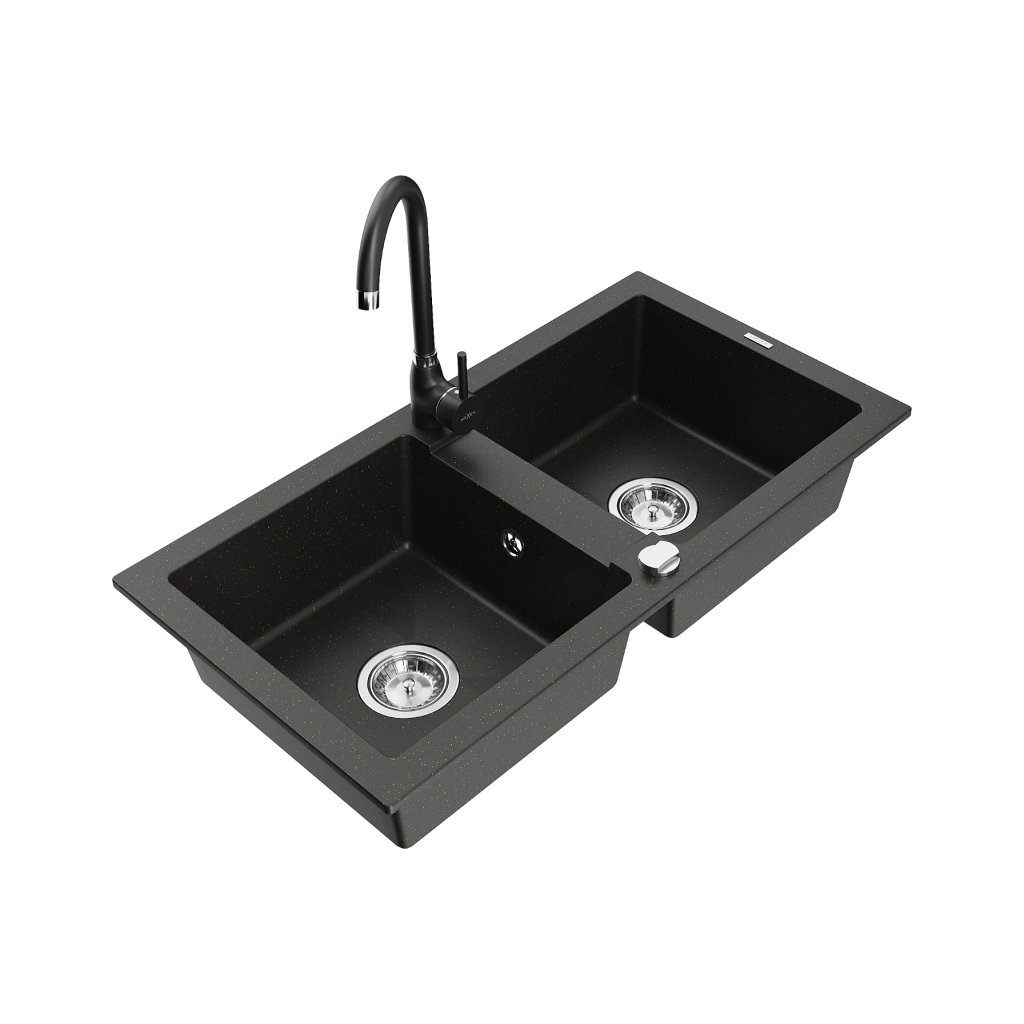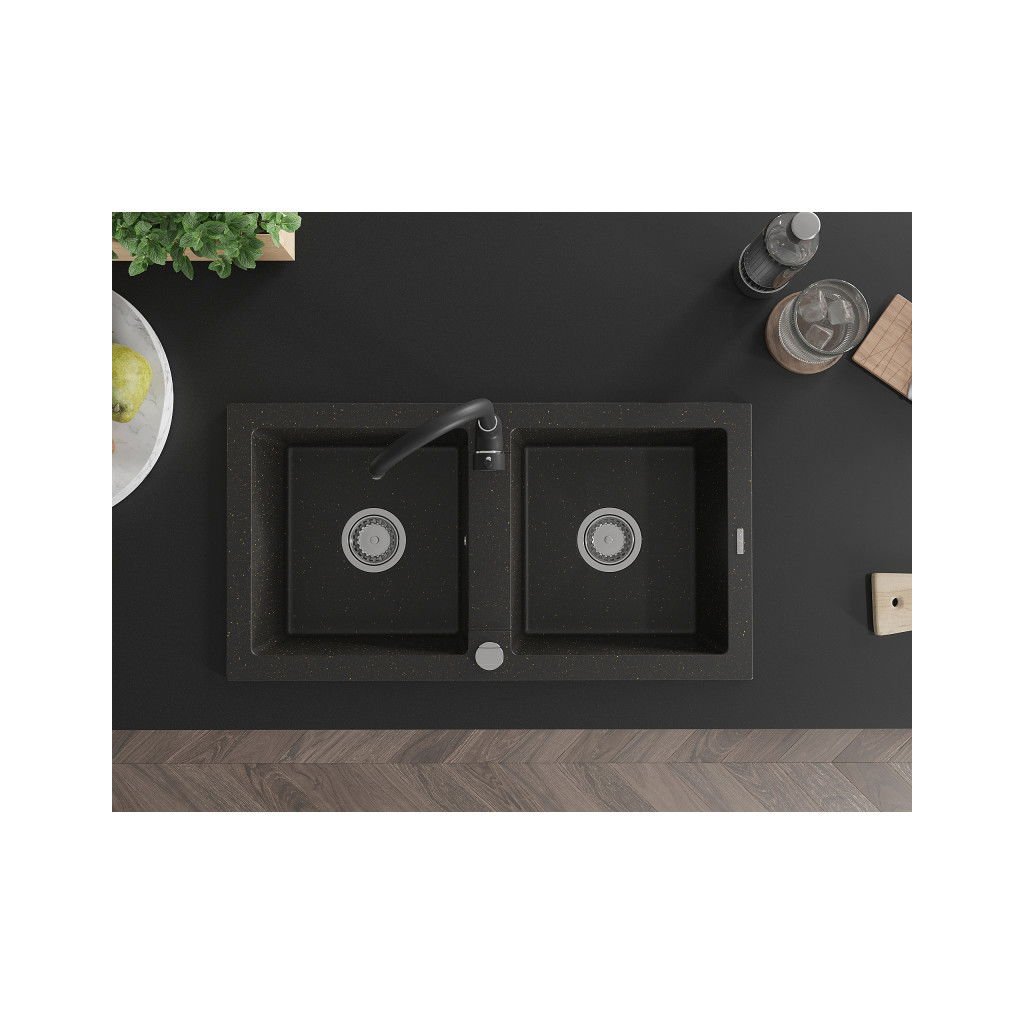 Mexen Mario, 2-komorový granitový dřez 82x44 cm s kuchyňskou baterií Telma, černá-zlatá, 6504-75-670200-70