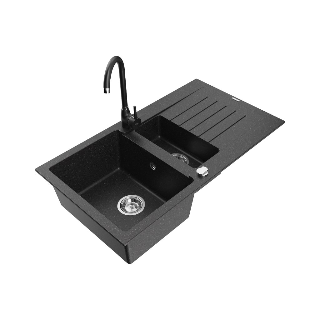Mexen Matias, 1,5-komorový granitový dřez s odkapávačem 90x50 cm a kuchyňskou baterií Telma, černá se stříbrnými tečkami, 6502-73-670200-70