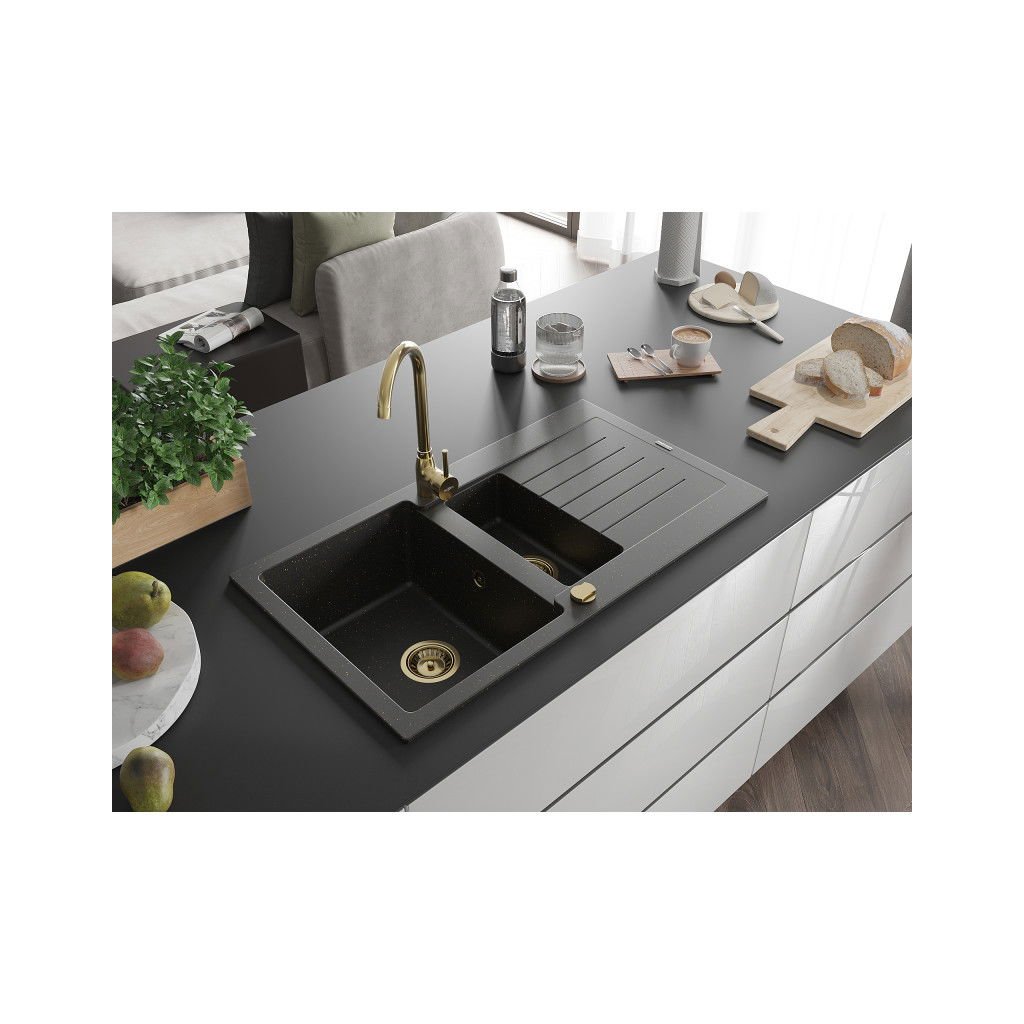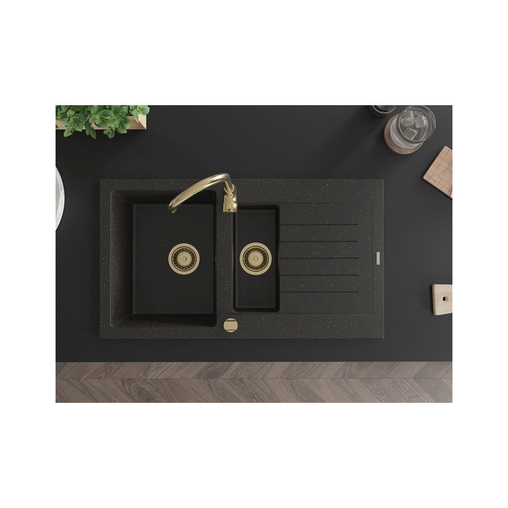 Mexen Matias, 1,5-komorový granitový dřez s odkapávačem 90x50 cm a kuchyňskou baterií Telma, černá-zlatá, 6502-75-670200-50
