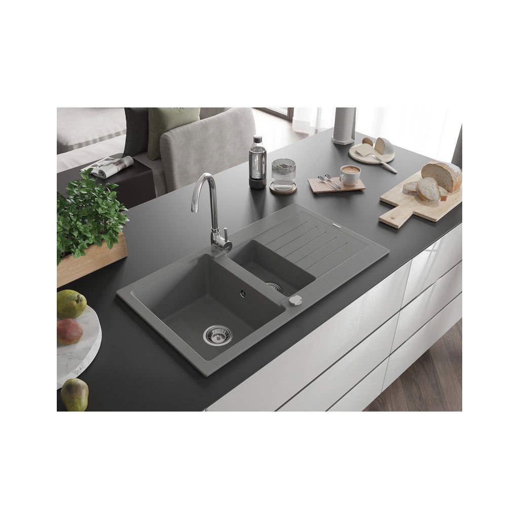 Mexen Matias granitový dřez 1,5 komorový s odkapávačem a kuchyňskou baterií Telma, šedá, 6502-71-670200-00
