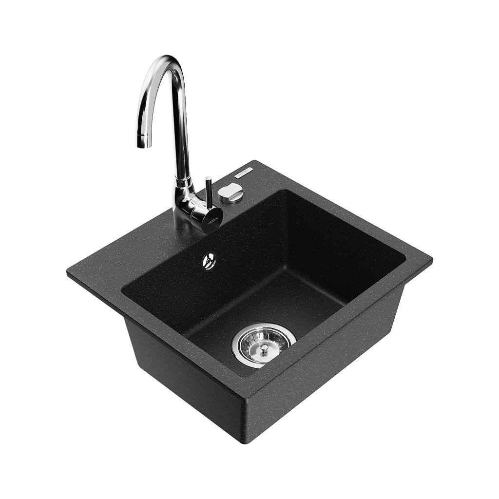Mexen Milo, 1-komorový granitový dřez 43,5x41 cm a kuchyňská baterie Telma, černá-stříbrná, 6505-73-670200-00