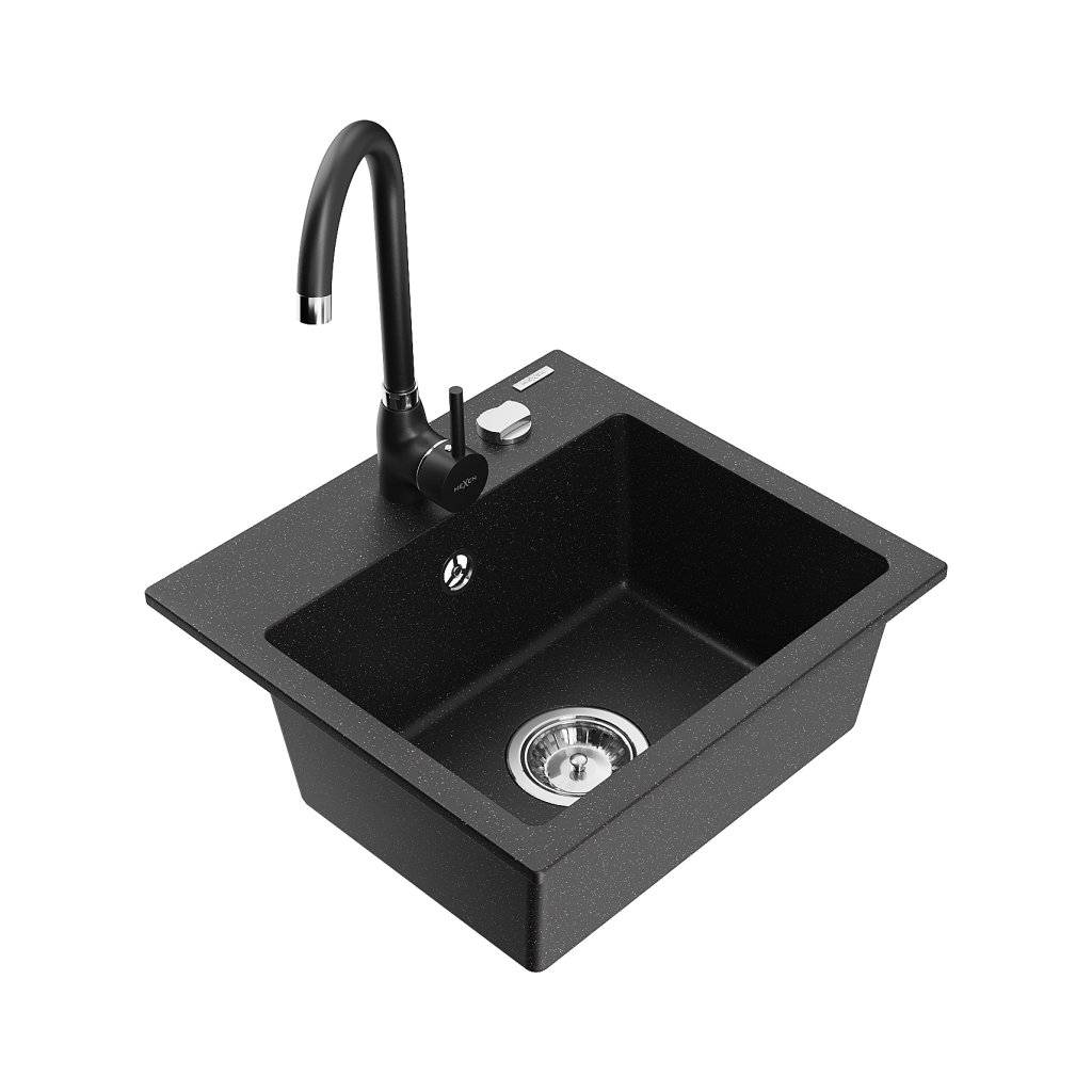 Mexen Milo, 1-komorový granitový dřez 43,5x41 cm a kuchyňská baterie Telma, černá-stříbrná, 6505-73-670200-70