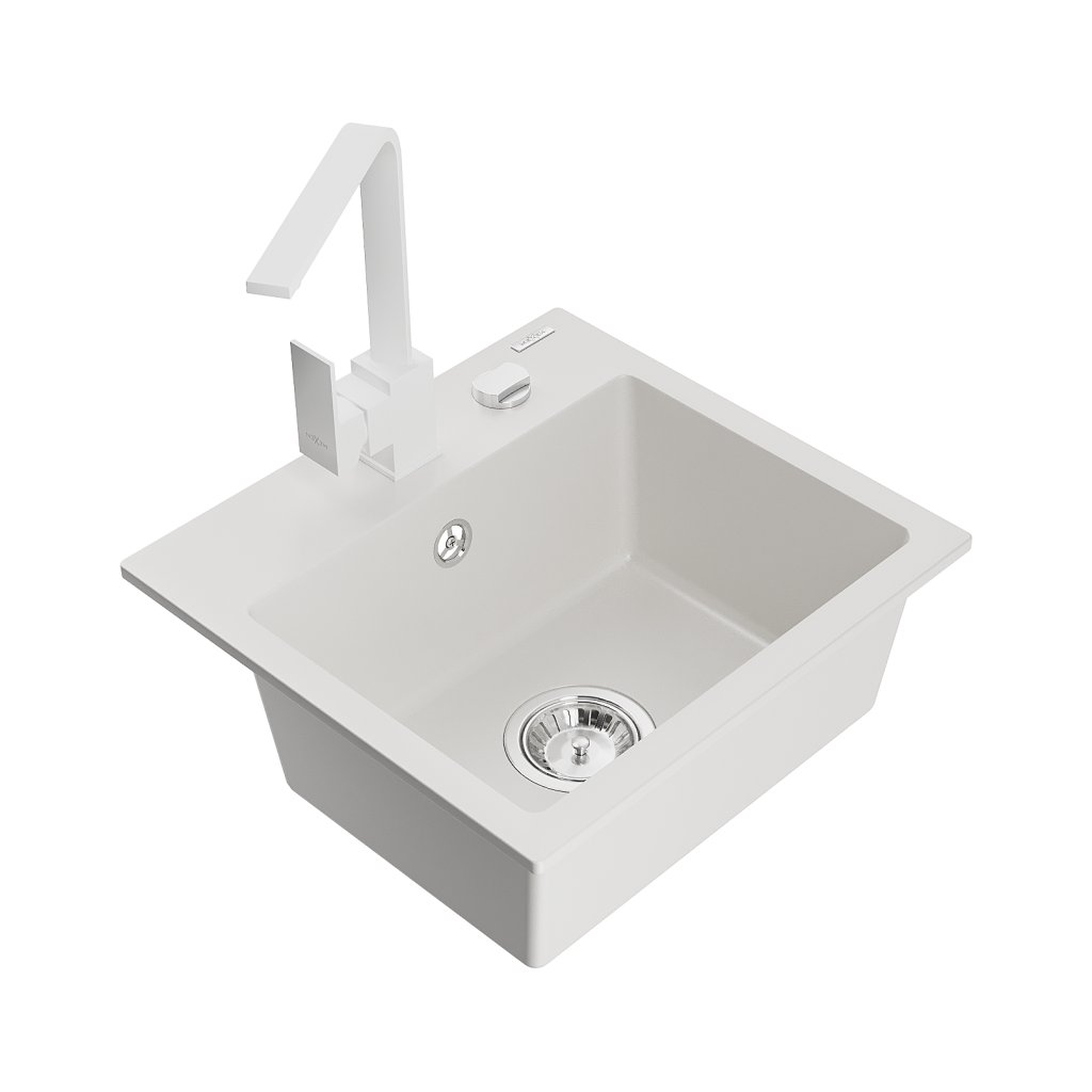 Mexen Milo, 1-komorový granitový dřez 435x410x171 mm a bílá baterie Rita, bílá, 6505-20-670300-20