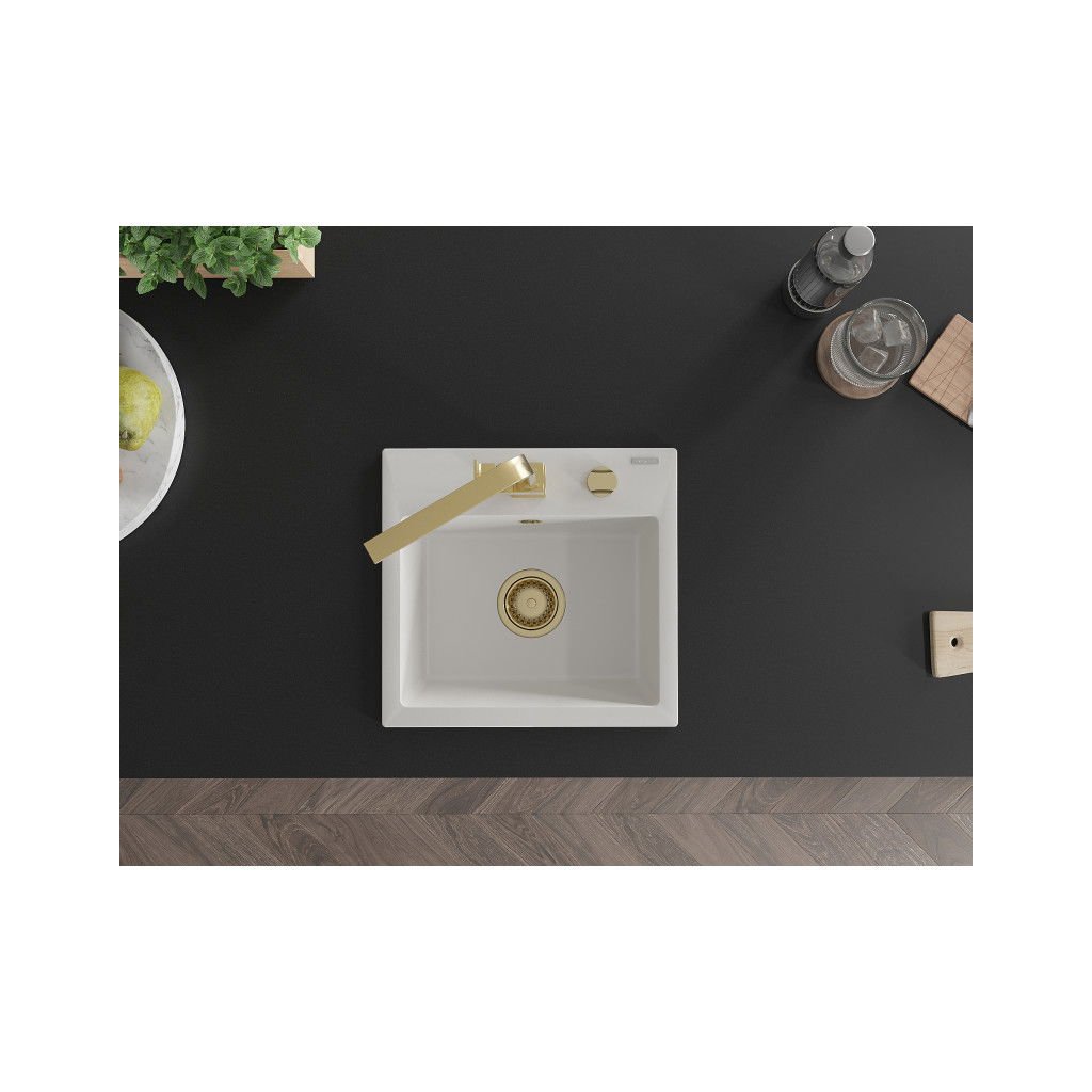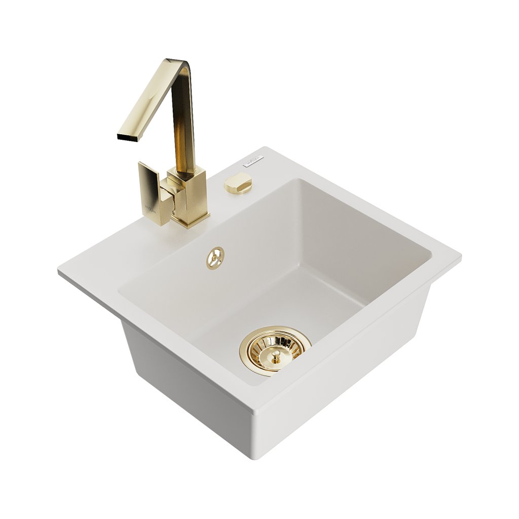 Mexen Milo, 1-komorový granitový dřez 435x410x171 mm a zlatá baterie Rita, bílá, 6505-20-670300-50