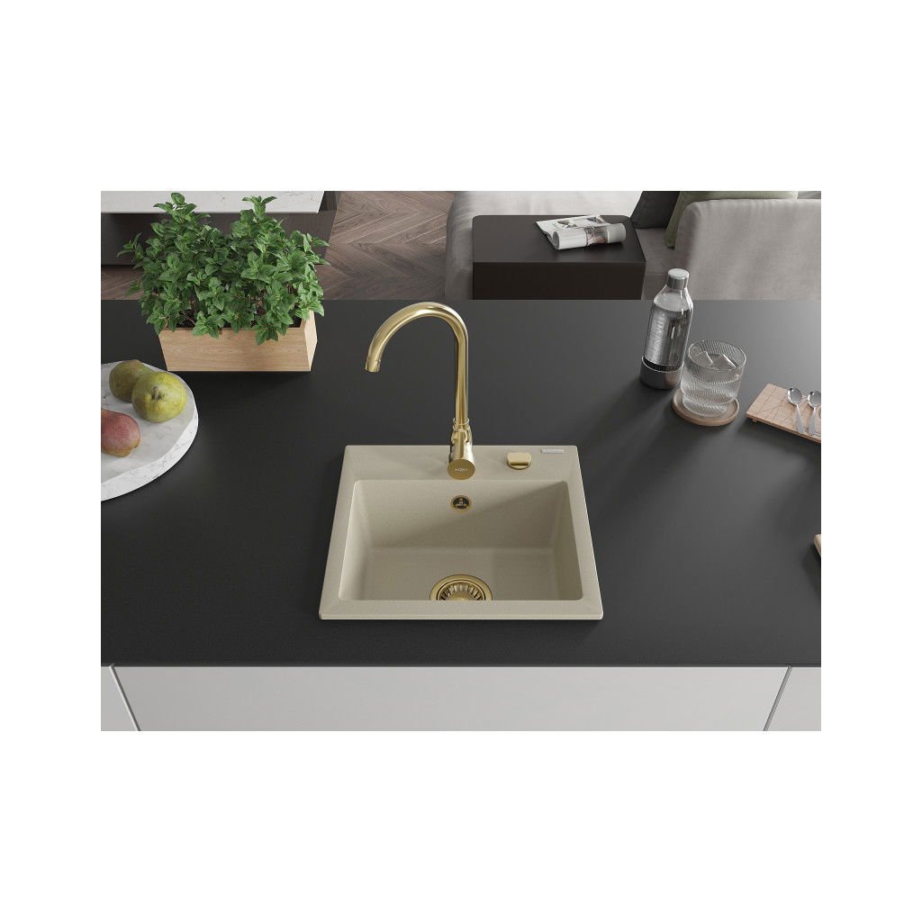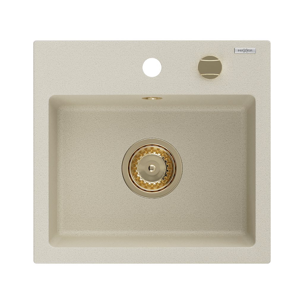 Mexen Milo, granitový dřez 435x410x171 mm, 1-komorový, béžová se zlatým sifonem, 6505441000-69-G