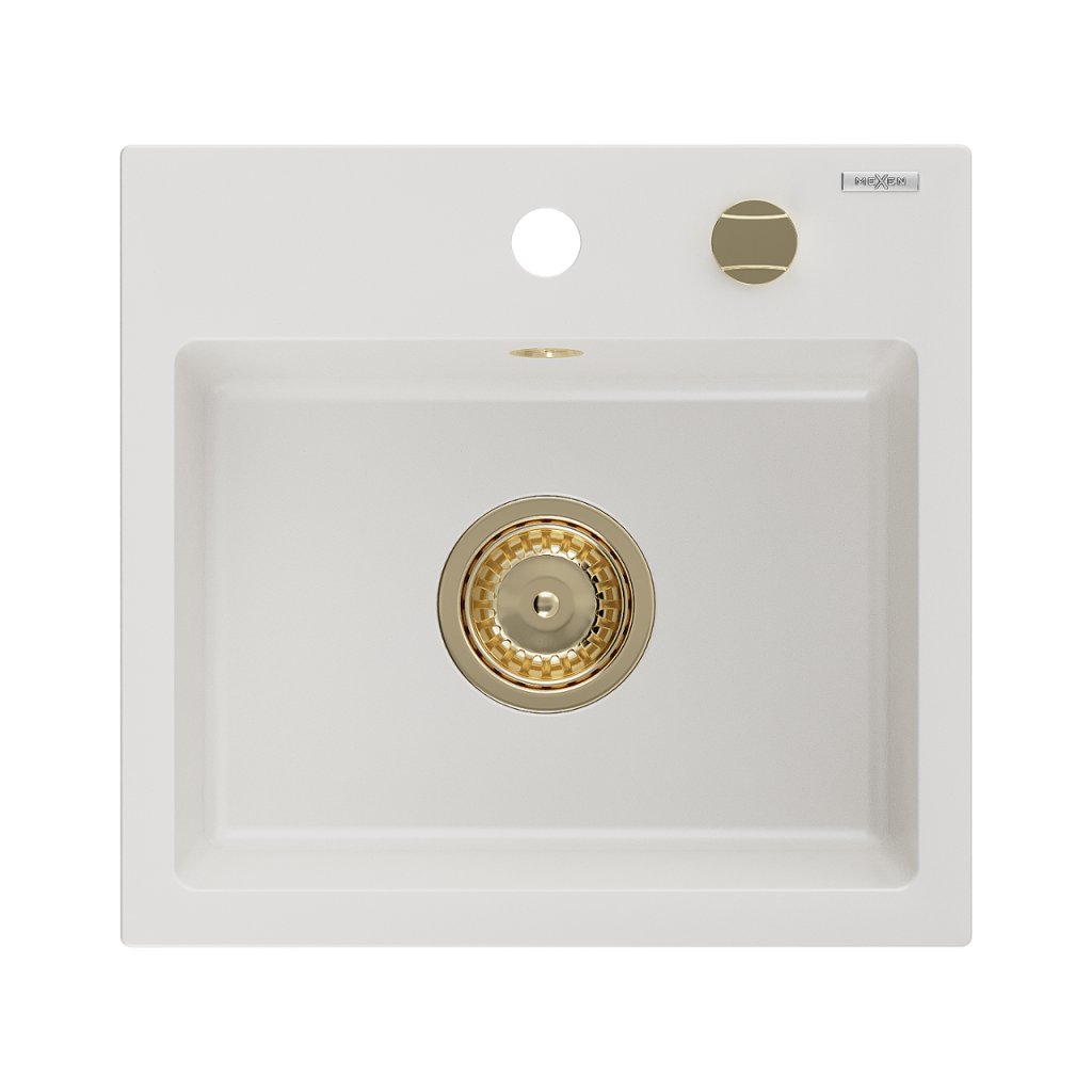 Mexen Milo, granitový dřez 435x410x171 mm, 1-komorový, bílá se zlatým sifonem, 6505441000-20-G