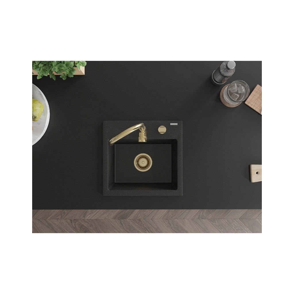 Mexen Milo, granitový dřez 435x410x171 mm, 1-komorový, černá-stříbrná metalíza se zlatým sifonem, 6505441000-73-G