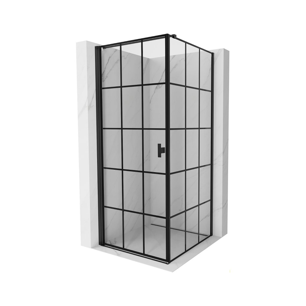 Mexen Mist-B, 1-křídlý výklopný sprchový kout levý 90 x 90 cm, čiré sklo-černá mřížka, 8A2T-090-090-70-77-L
