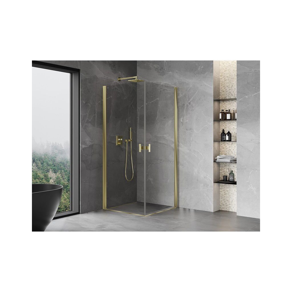 Mexen Mist-B Duo, 2-křídlý výklopný sprchový kout 80 x 80 cm, čiré sklo, zlatý lesklý profil, 8A2-080-080-50-00