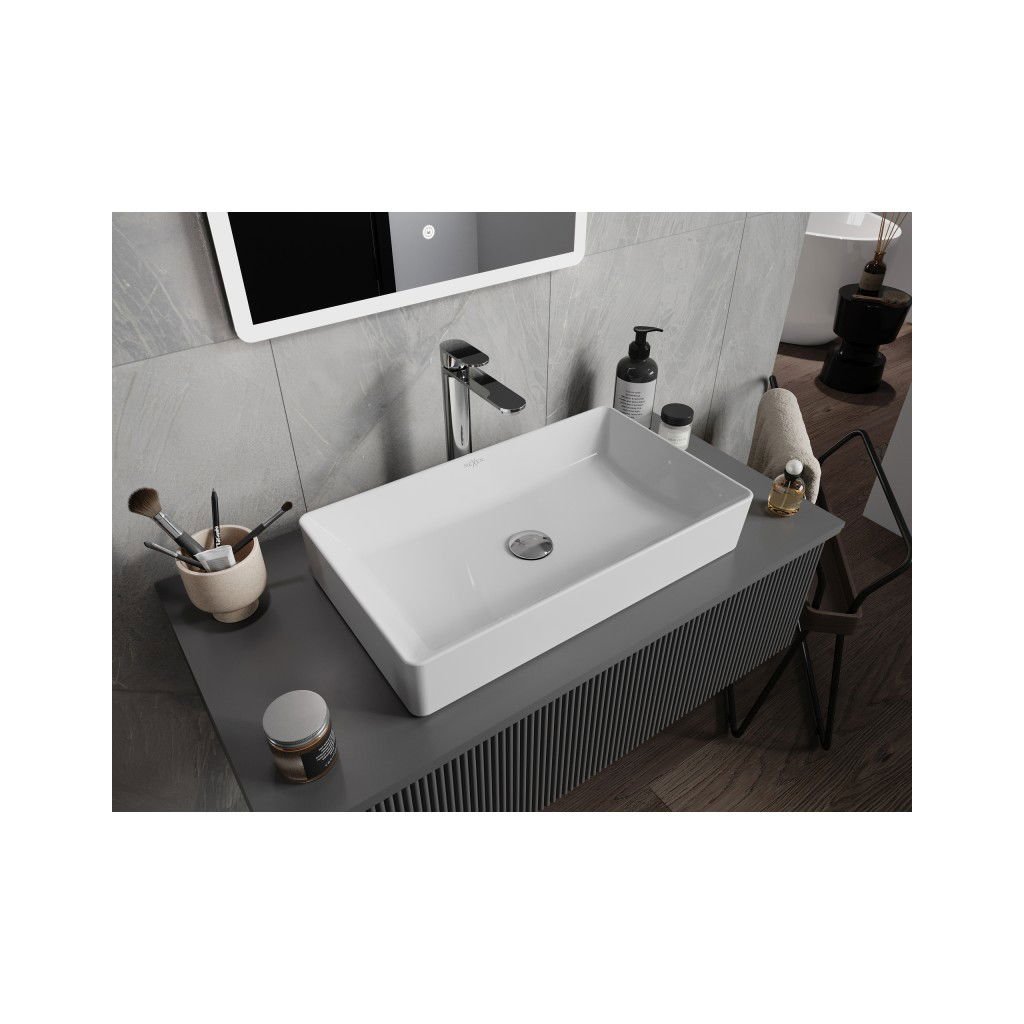 Obdélníkové umyvadlo na desku Mexen Nadia je model o rozměrech 60x35 cm - prostorné, efektivní na pracovní desce a hlavně funkční. To vám umožní provádět denní hygienu bez obav ze stříkající vody, přičemž je hlavní ozdobou koupelny. Mexen Nadia je umyvadlo na desce, které se vyznačuje uspořádáním minimalismu. V důsledku chybějícího přepadového otvoru vytváří jednotný geometrický materiál. V umyvadle výrobce nepoužil otvor pro baterii, který umožňuje zkombinovat keramiku s působivým stojícím kohoutkem značky Mexen.