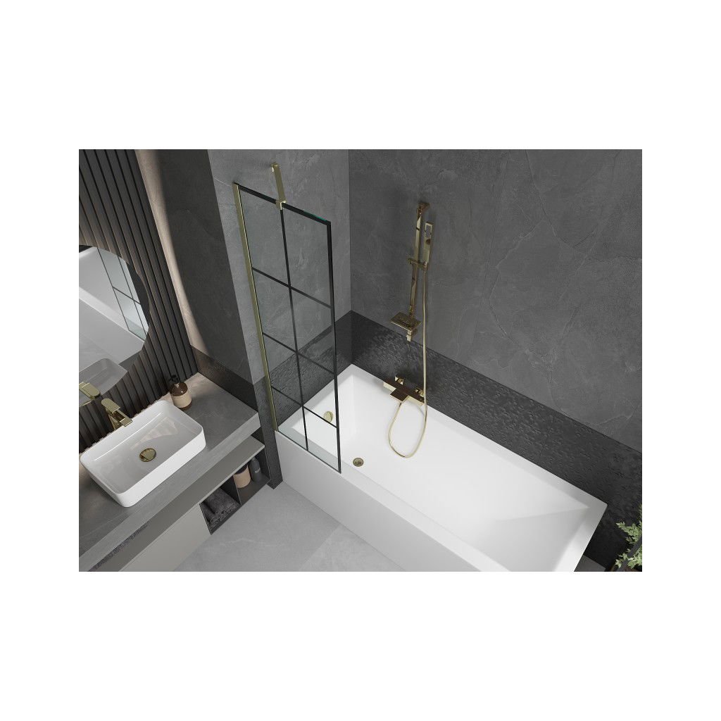 Mexen Next, 1-křídlová vanová zástěna 50 x 150 cm, 6mm čiré sklo - černý vzor, zlatá matná, 895-050-000-00-77-55