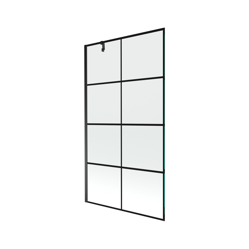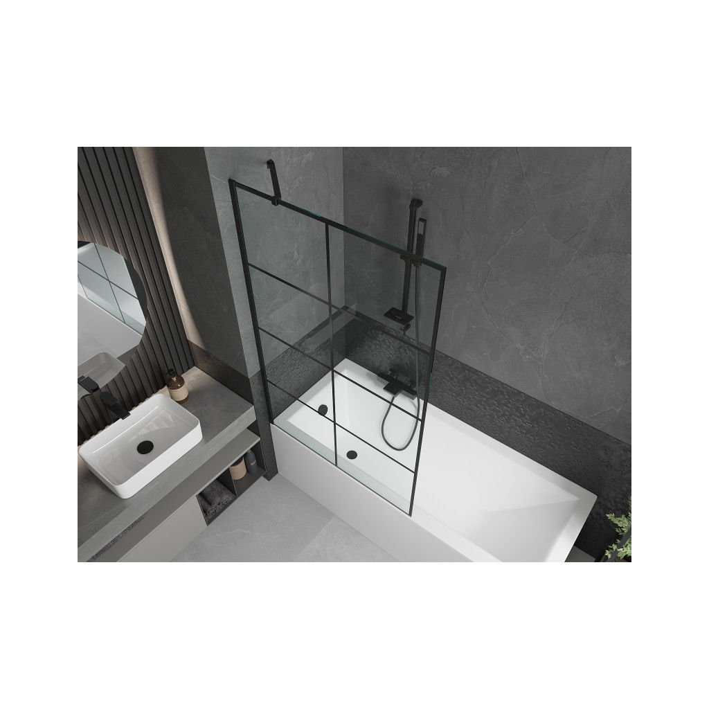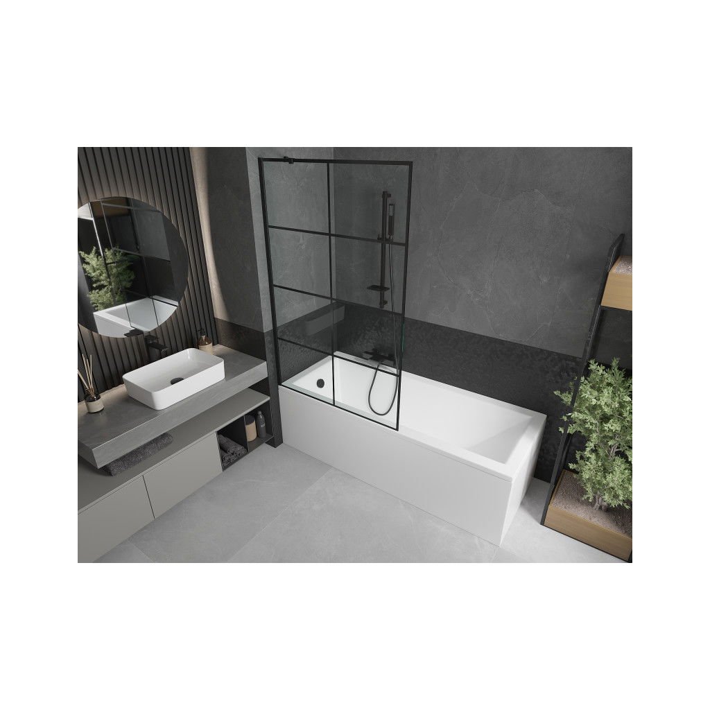 Mexen Next, vanová zástěna 1-křídlová 100 x 150 cm, fixní křídlo, 6 mm čiré sklo s černým vzorem, černý profil, 895-100-000-00-77-70