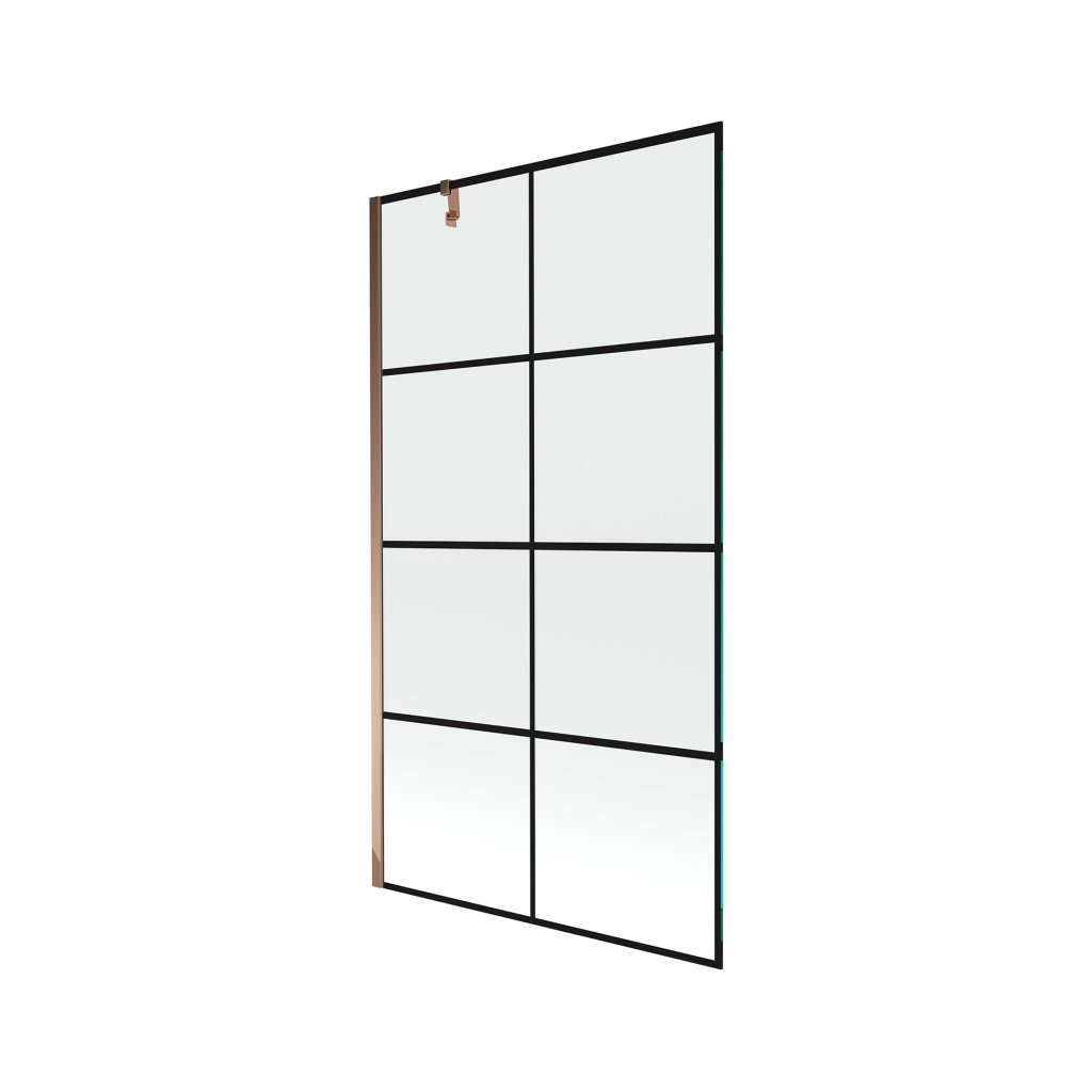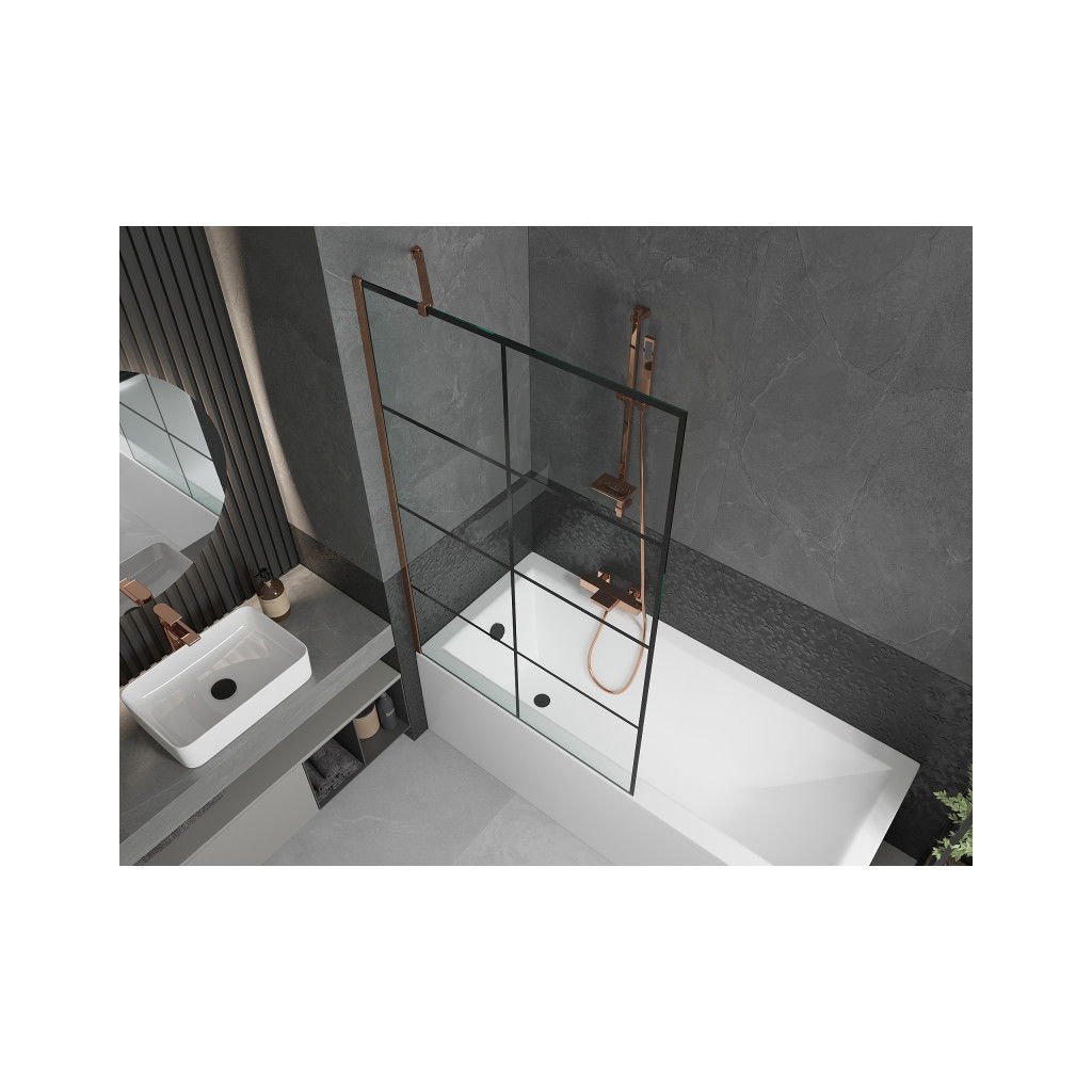 Mexen Next, vanová zástěna 1-křídlová 100 x 150 cm, fixní křídlo, 6 mm čiré sklo s černým vzorem, růžové zlato profil, 895-100-000-00-77-60