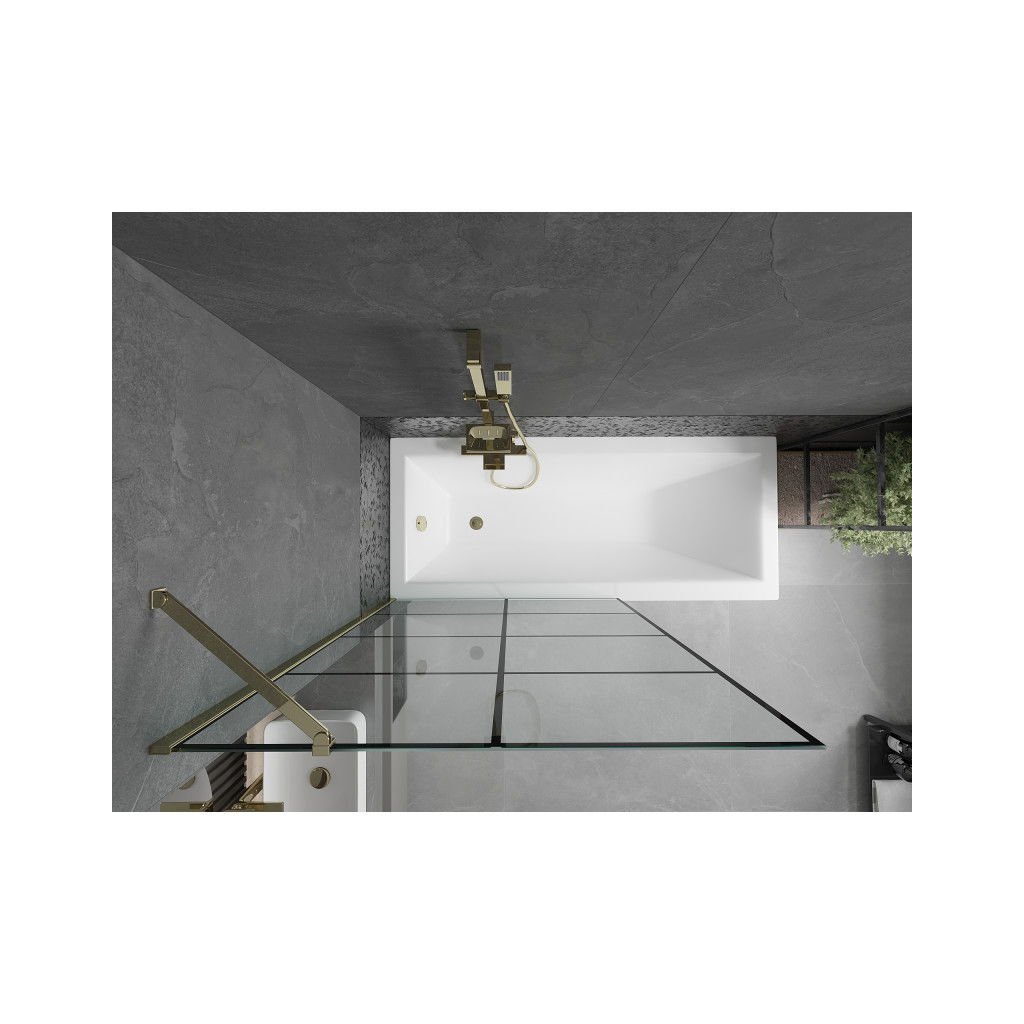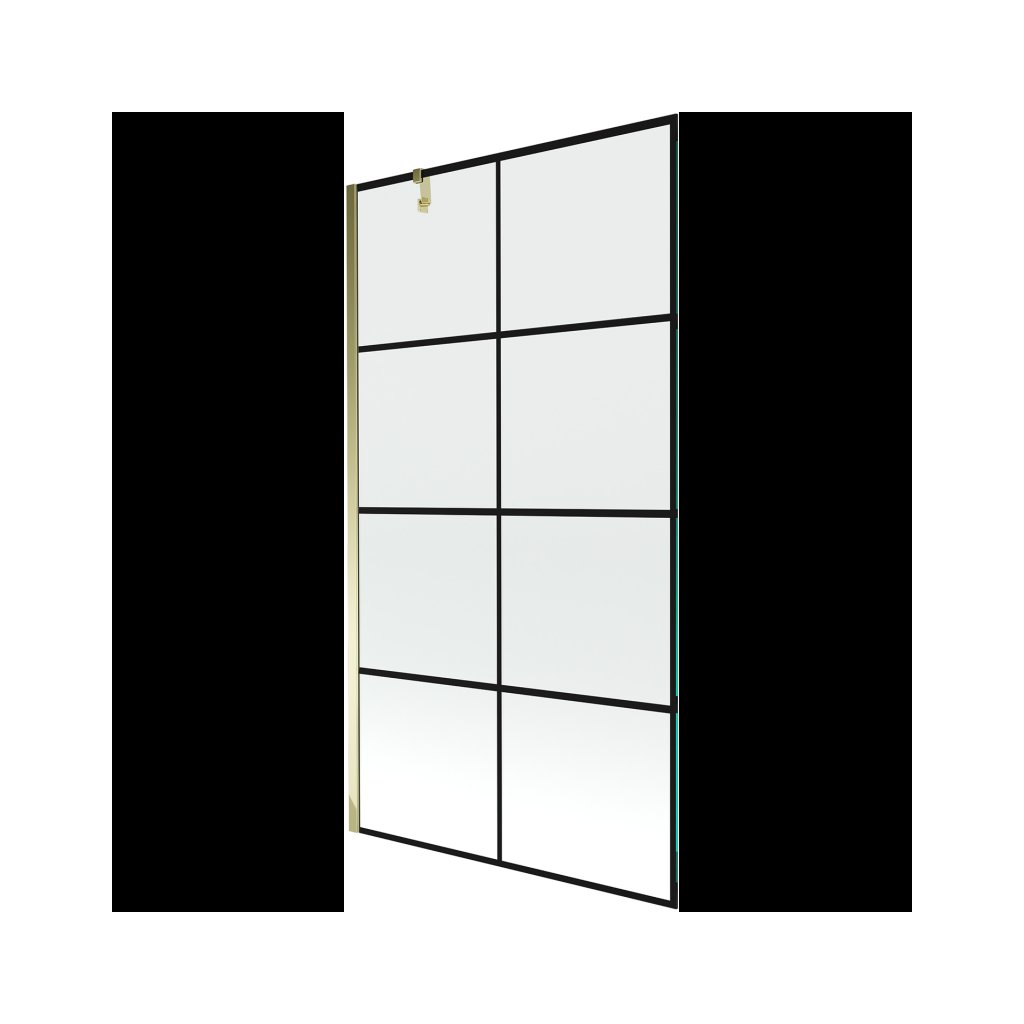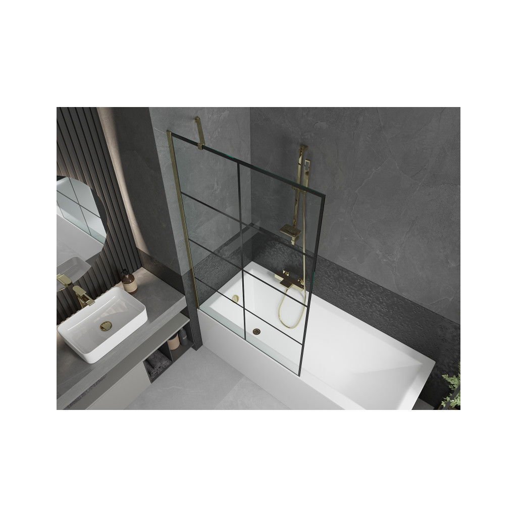Mexen Next, vanová zástěna 1-křídlová 100 x 150 cm, fixní křídlo, 6 mm čiré sklo s černým vzorem, zlatý profil, 895-100-000-00-77-50