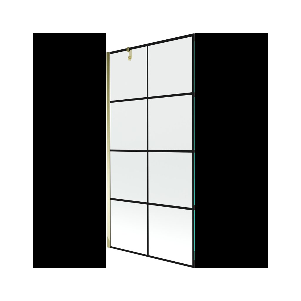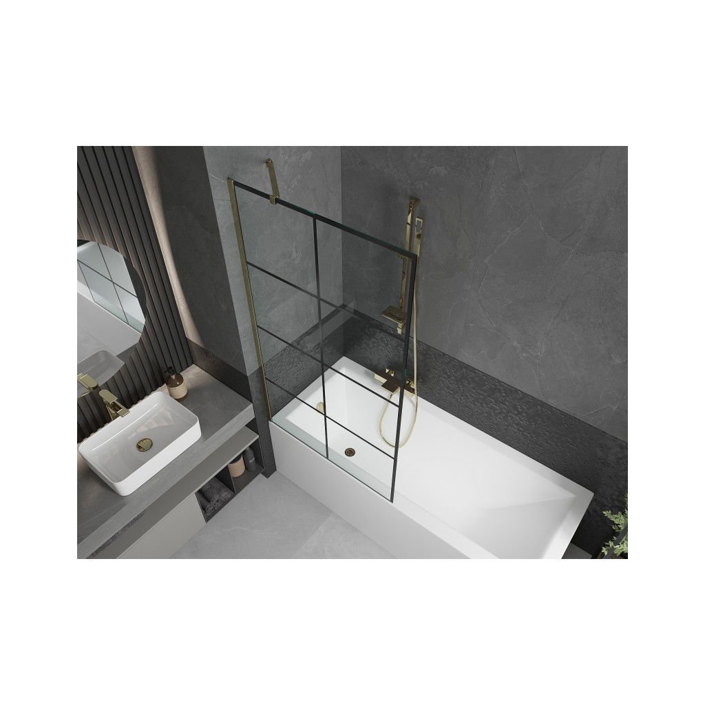 Mexen Next, vanová zástěna 1-křídlová 90 x 150 cm, fixní křídlo, 6 mm čiré sklo s černým vzorem, zlatý profil, 895-090-000-00-77-50