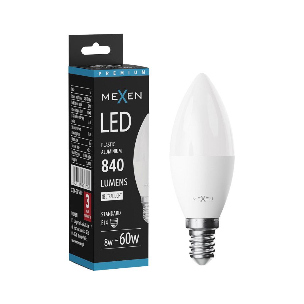 Mexen Nova, LED žárovka E14, C37, 8W, teplá - 3000K, 840 lm - L102-E14-0830-01