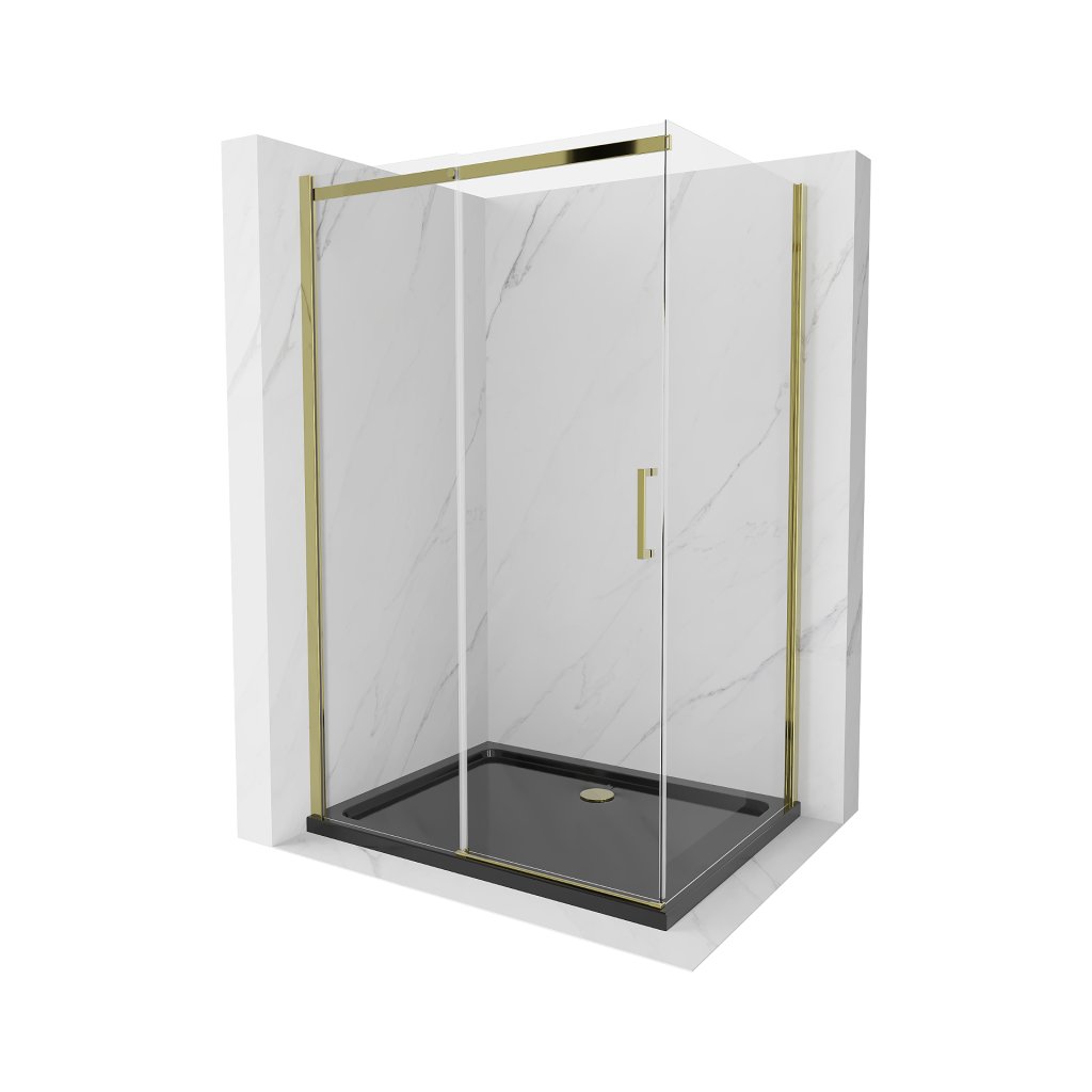 Mexen Omega, sprchový kout s posuvnými dveřmi 100 (dveře) x 80 (stěna) cm, 8mm čiré sklo, zlatý profil + slim sprchová vanička černá + zlatý sifon, 825-100-080-50-00-4070G