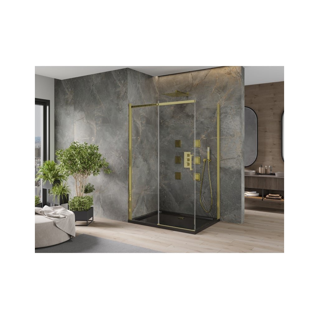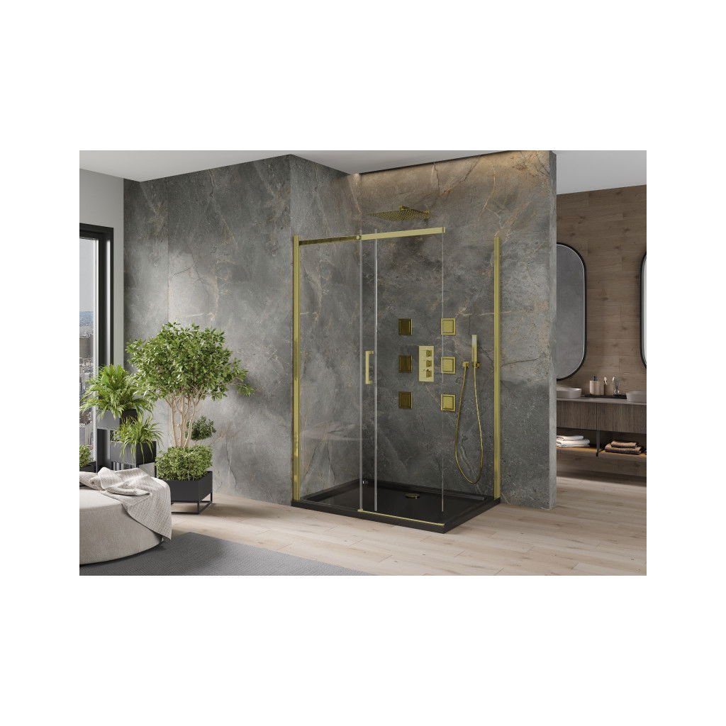 Mexen Omega, sprchový kout s posuvnými dveřmi 120 (dveře) x 80 (stěna) cm, 8mm čiré sklo, zlatý profil + slim sprchová vanička černá + zlatý sifon, 825-120-080-50-00-4070G