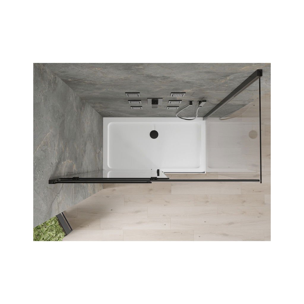 Mexen Omega, sprchový kout s posuvnými dveřmi 130 (dveře) x 70 (stěna) cm, 8mm čiré sklo, černý profil + slim sprchová vanička bílá s černým sifonem, 825-130-070-70-00-4010B
