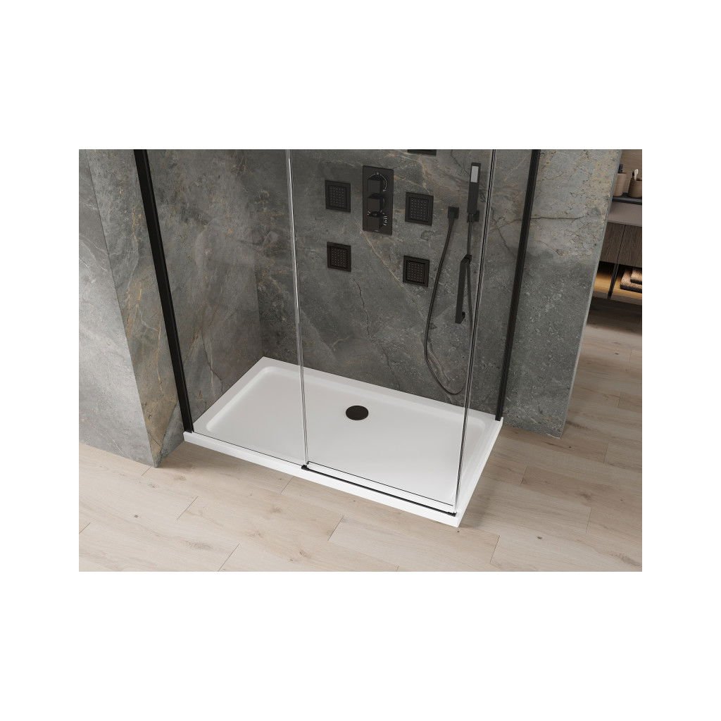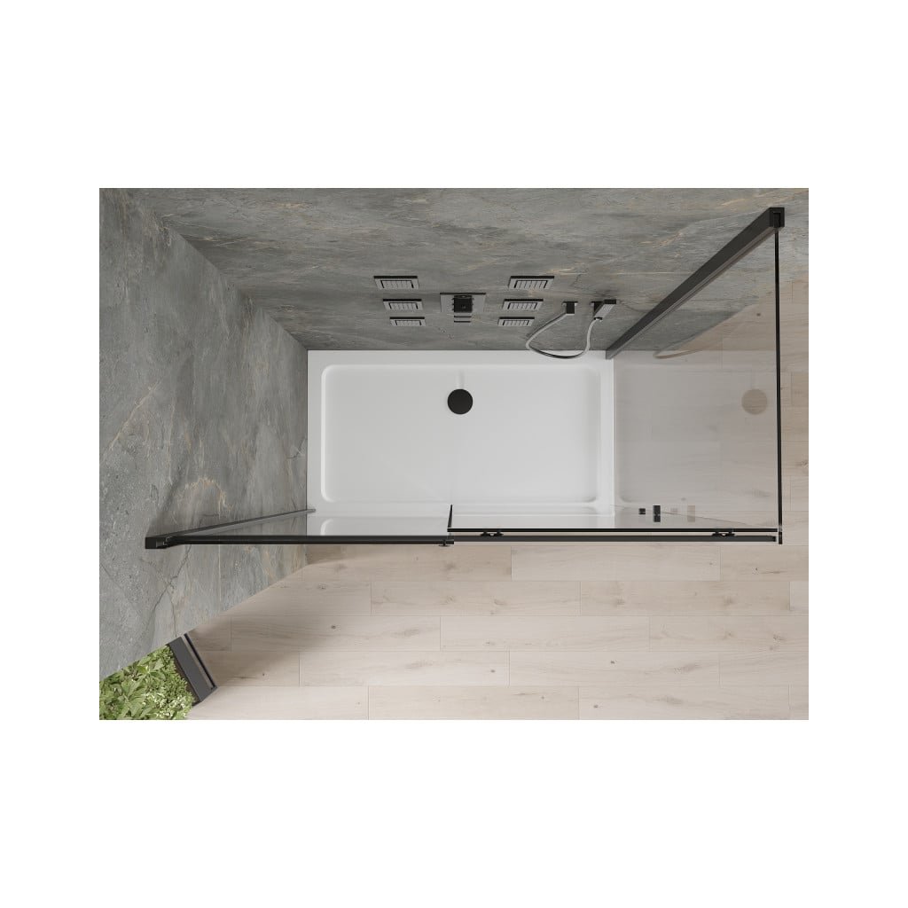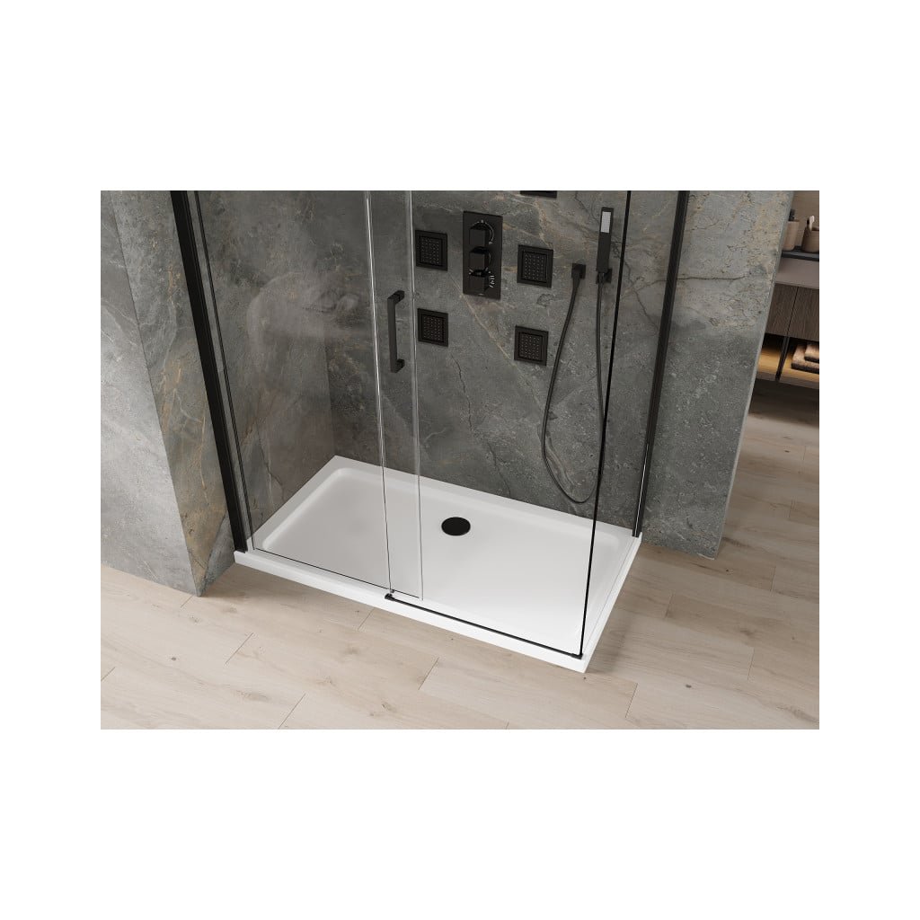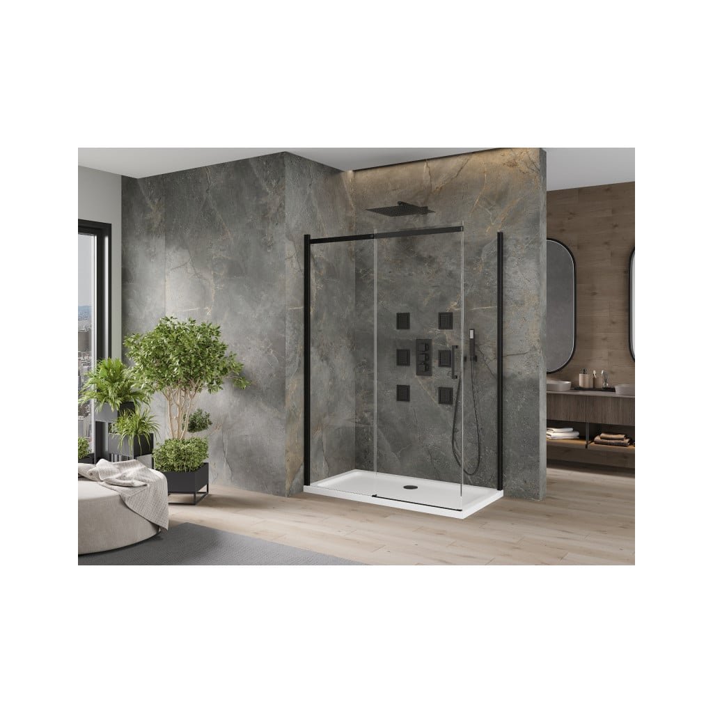 Mexen Omega, sprchový kout s posuvnými dveřmi 140 (dveře) x 80 (stěna) cm, 8mm čiré sklo, černý profil + slim sprchová vanička bílá s černým sifonem, 825-140-080-70-00-4010B