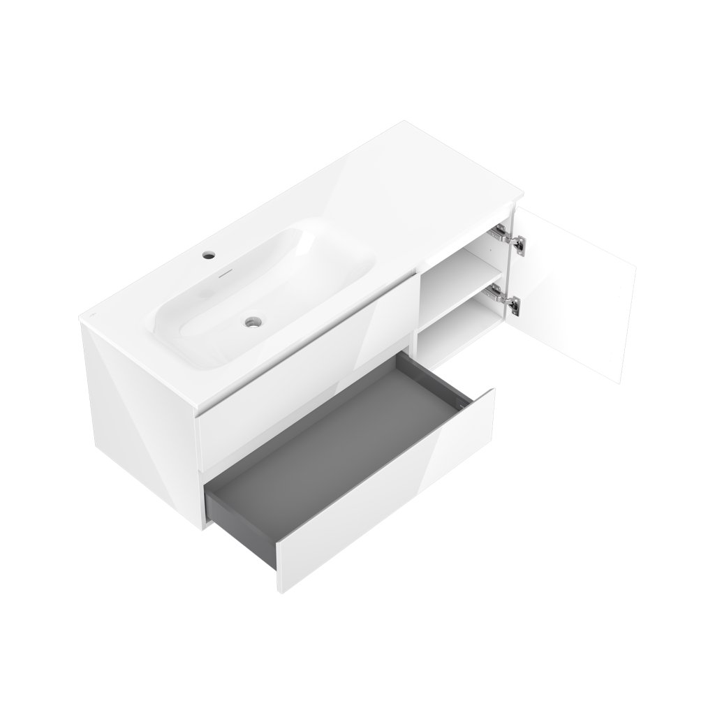 Mexen Orio, koupelnová skříňka 120 cm s umyvadlem Vela vlevo, 2S, 1D, bílá lesklá, 91A13-12047-3-BBFFF00-W23L00