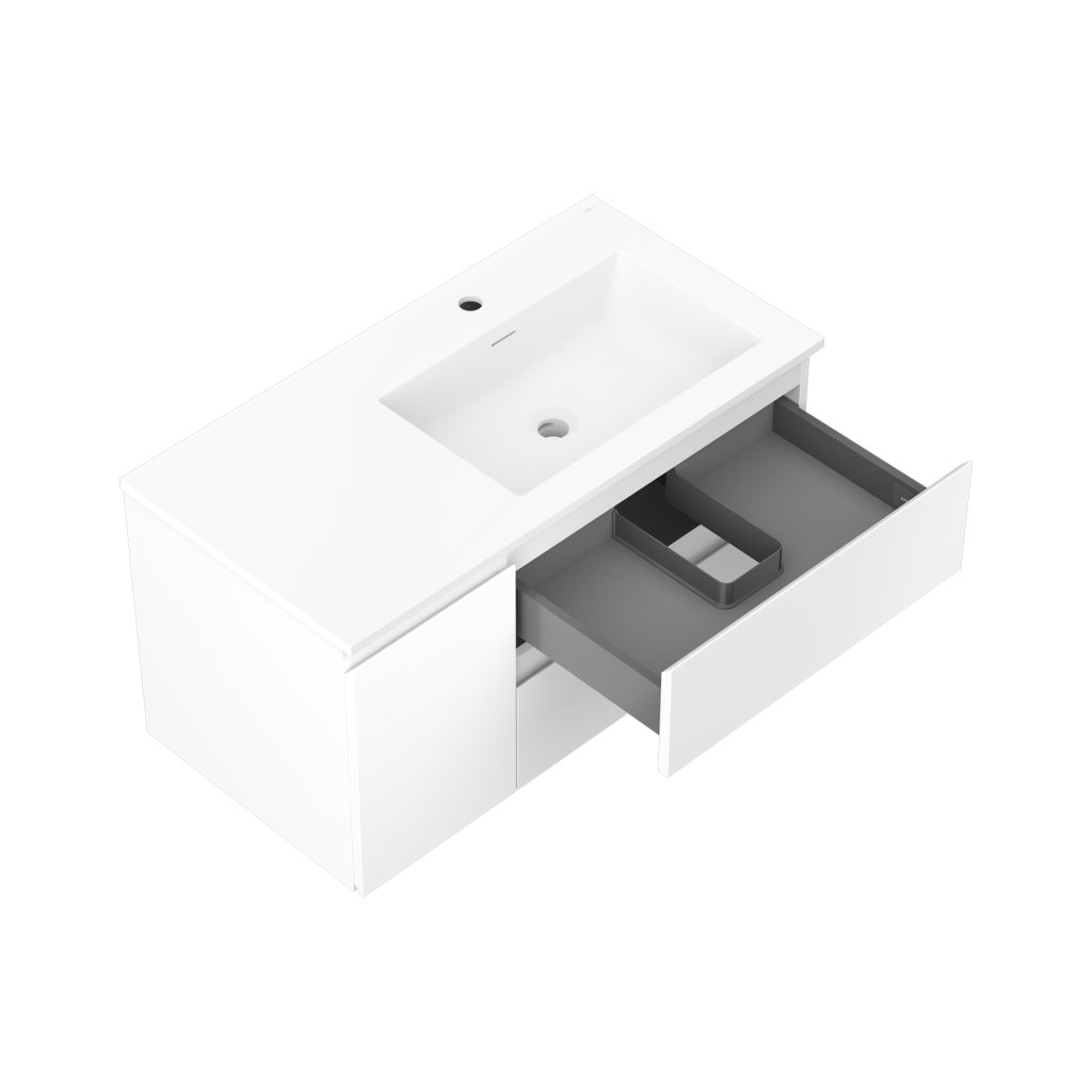 Mexen Orio, koupelnová skříňka 90 cm s pravým umyvadlem Otis, 2S, 1D, bílá matná, 91A13-09047-3-BBFFF01-W18P01