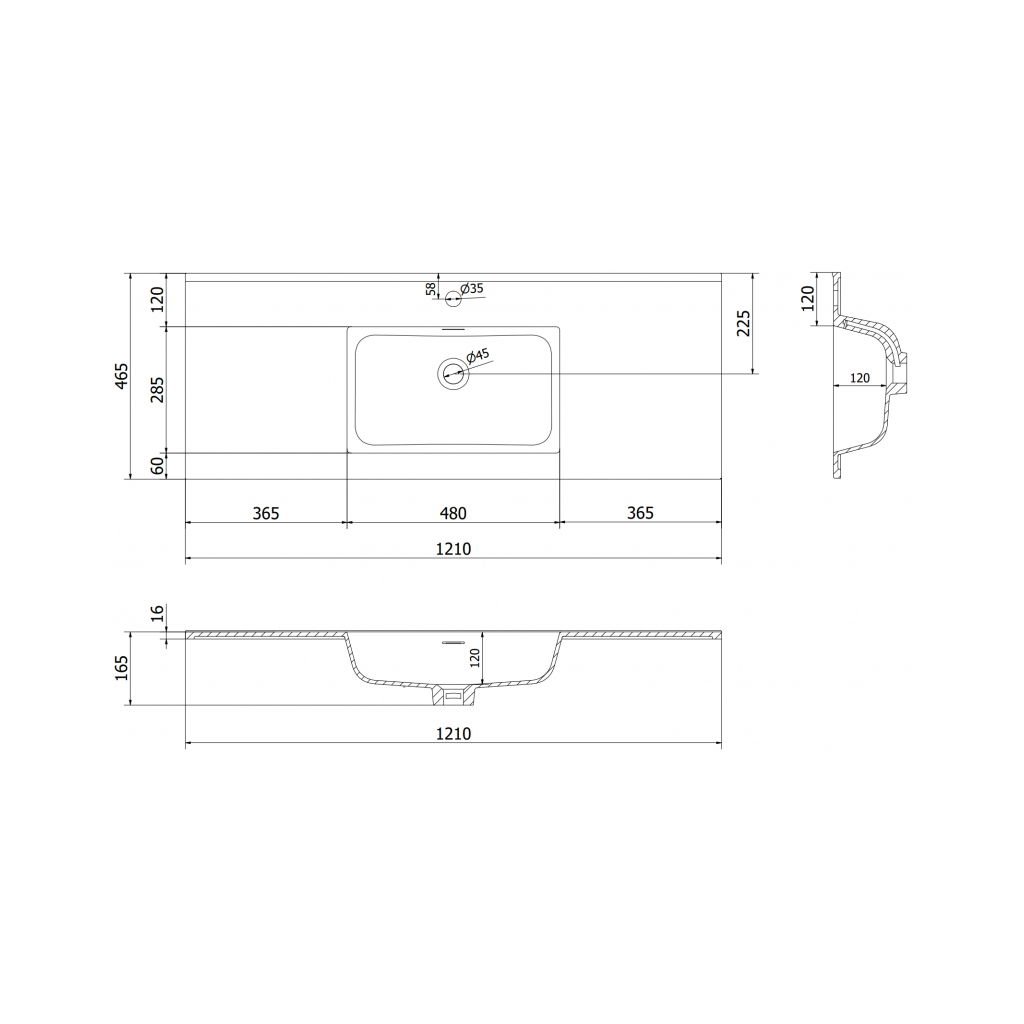 Technické údaje: Rozměry: 121x46,5x16,8 cm Hloubka: 11,9 cm Typ: Zapuštění do pracovní desky Barva: černá matná Materiál: konglomerát Přepadový otvor: Ano Otvor na baterii: AnoDoplňkové parametry