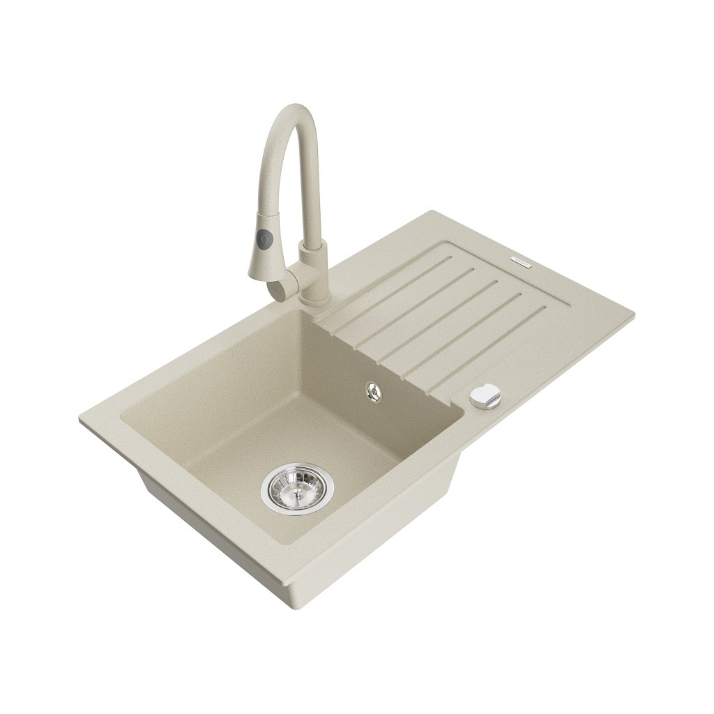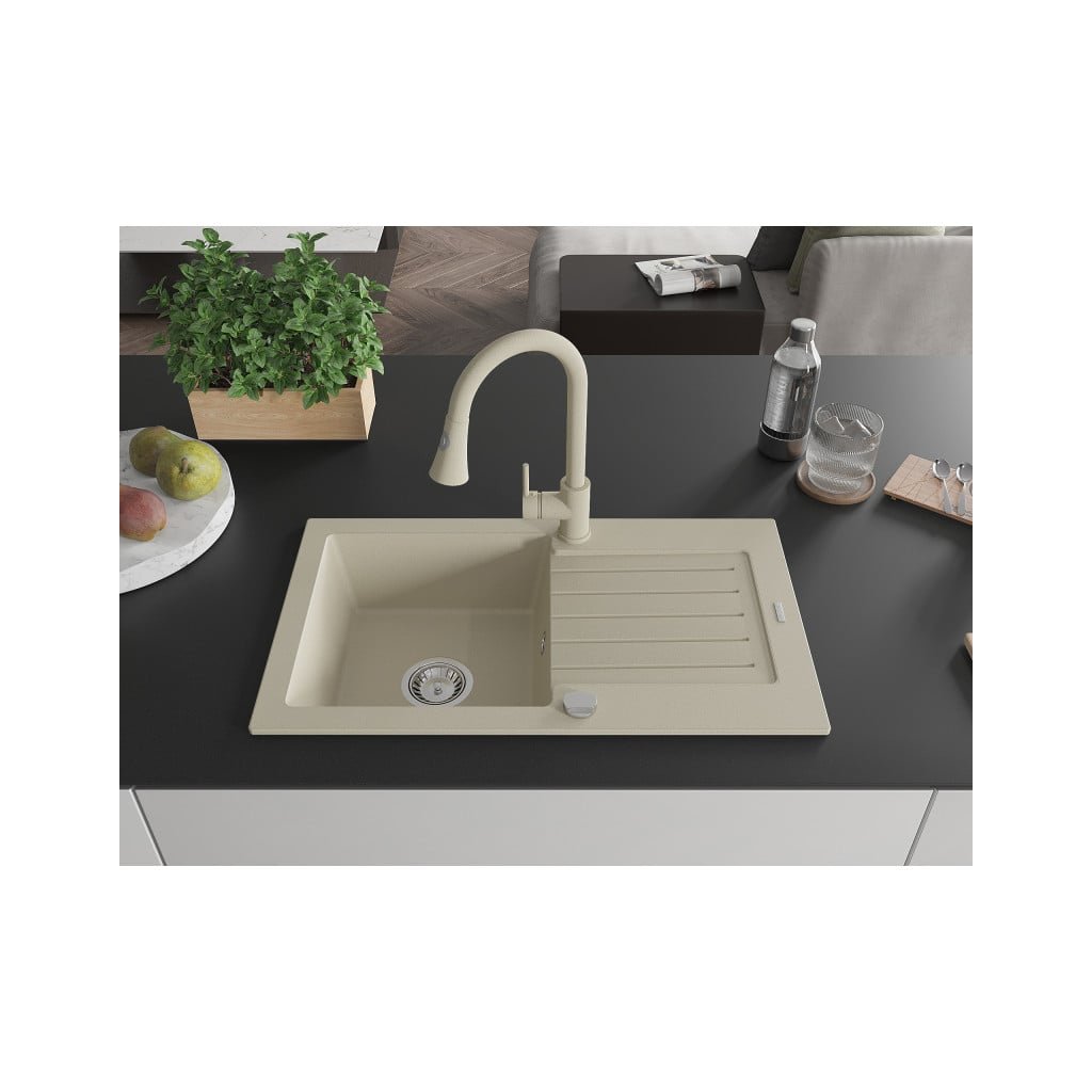 Mexen Pablo, 1-komorový granitový dřez 752x436x161 mm a dřezová baterie Elia, béžová, 6510-69-670101-69