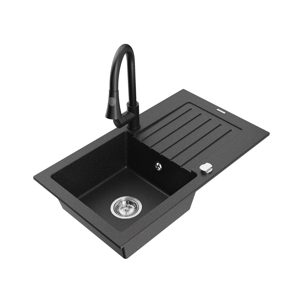Mexen Pablo, 1-komorový granitový dřez 752x436x161 mm a dřezová baterie Elia, černá-stříbrná metalíza, 6510-73-670101-70