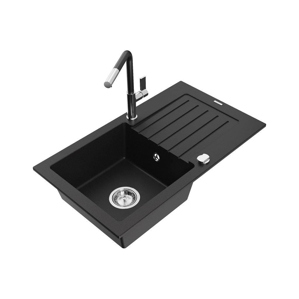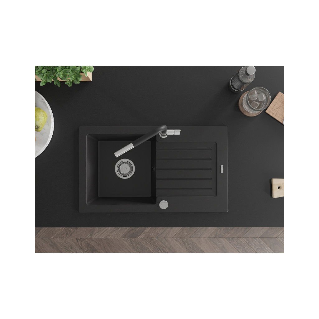 Mexen Pablo, 1-komorový granitový dřez 752x436x161 mm a dřezová baterie Flora, černá, 6510-77-670401-07