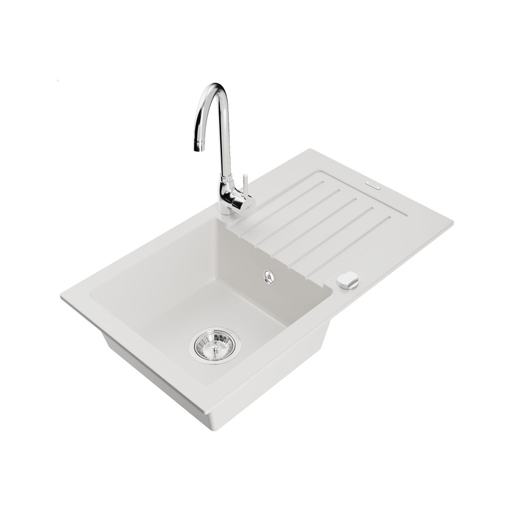 Mexen Pablo, 1-komorový granitový dřez s odkapávačem 75x44 cm a kuchyňskou baterií Telma, bílá, 6510-20-670200-00