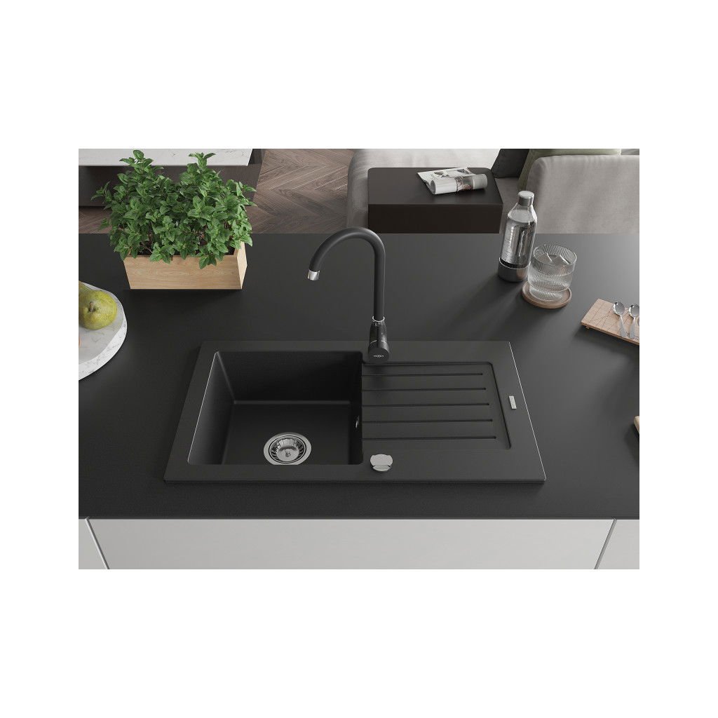 Mexen Pablo, 1-komorový granitový dřez s odkapávačem 75x44 cm a kuchyňskou baterií Telma, černá, 6510-77-670200-70