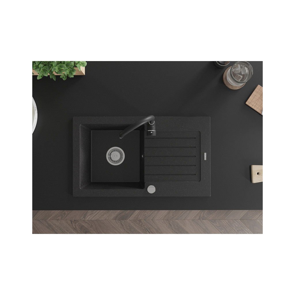 Mexen Pablo, 1-komorový granitový dřez s odkapávačem 75x44 cm a kuchyňskou baterií Telma, černá-stříbrná, 6510-73-670200-70