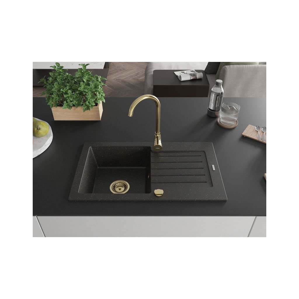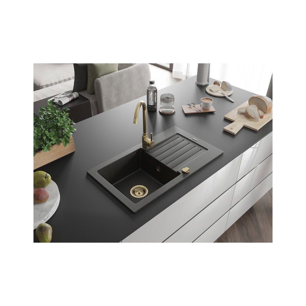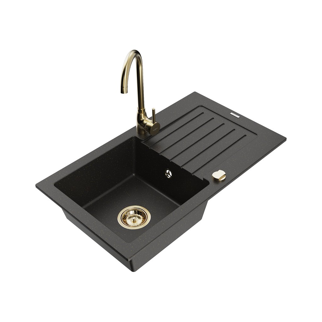 Mexen Pablo, 1-komorový granitový dřez s odkapávačem 75x44 cm a kuchyňskou baterií Telma, černá-zlatá, 6510-75-670200-50
