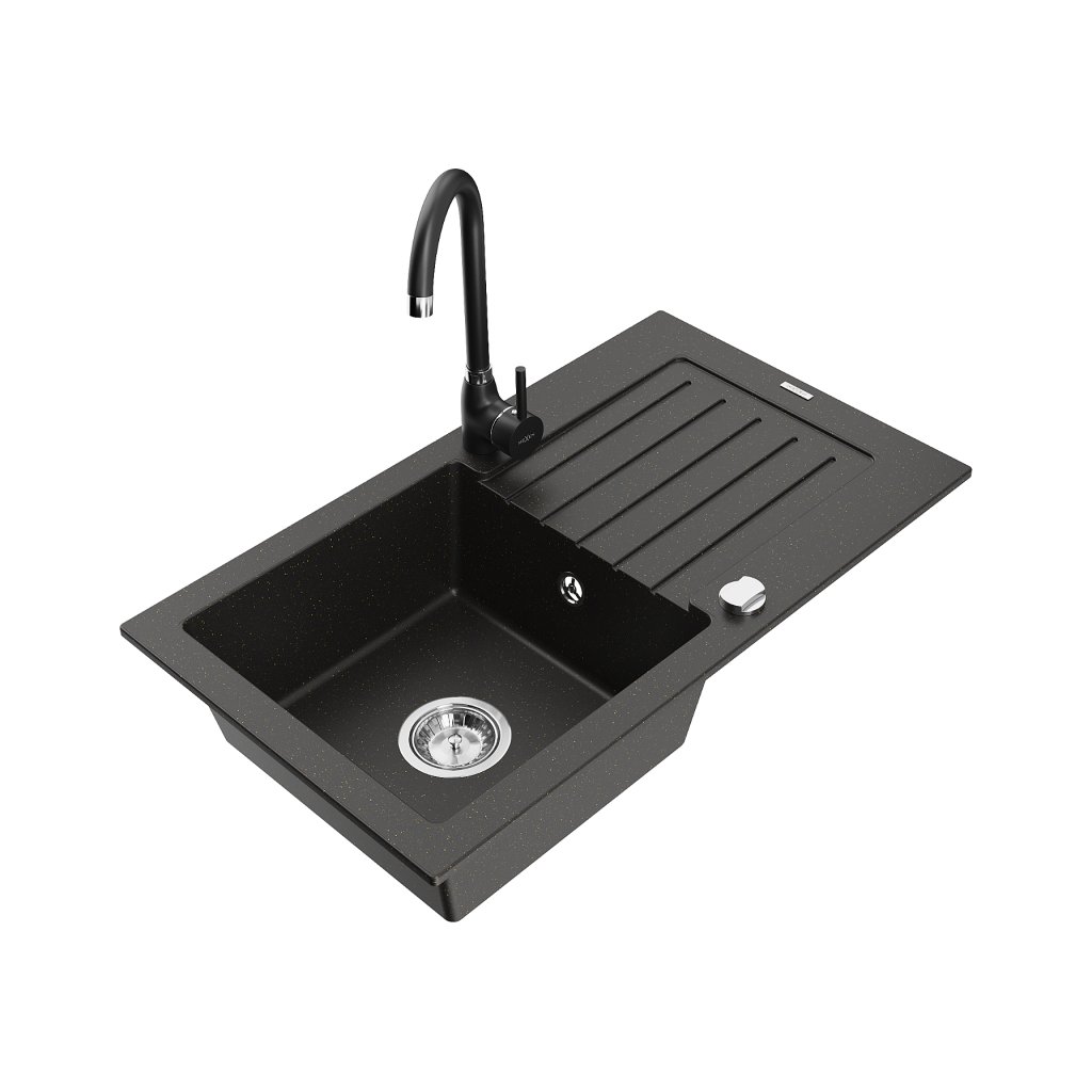 Mexen Pablo, 1-komorový granitový dřez s odkapávačem 75x44 cm a kuchyňskou baterií Telma, černá-zlatá, 6510-75-670200-70