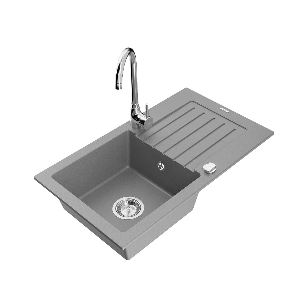 Mexen Pablo, 1-komorový granitový dřez s odkapávačem 75x44 cm a kuchyňskou baterií Telma, šedá, 6510-71-670200-00