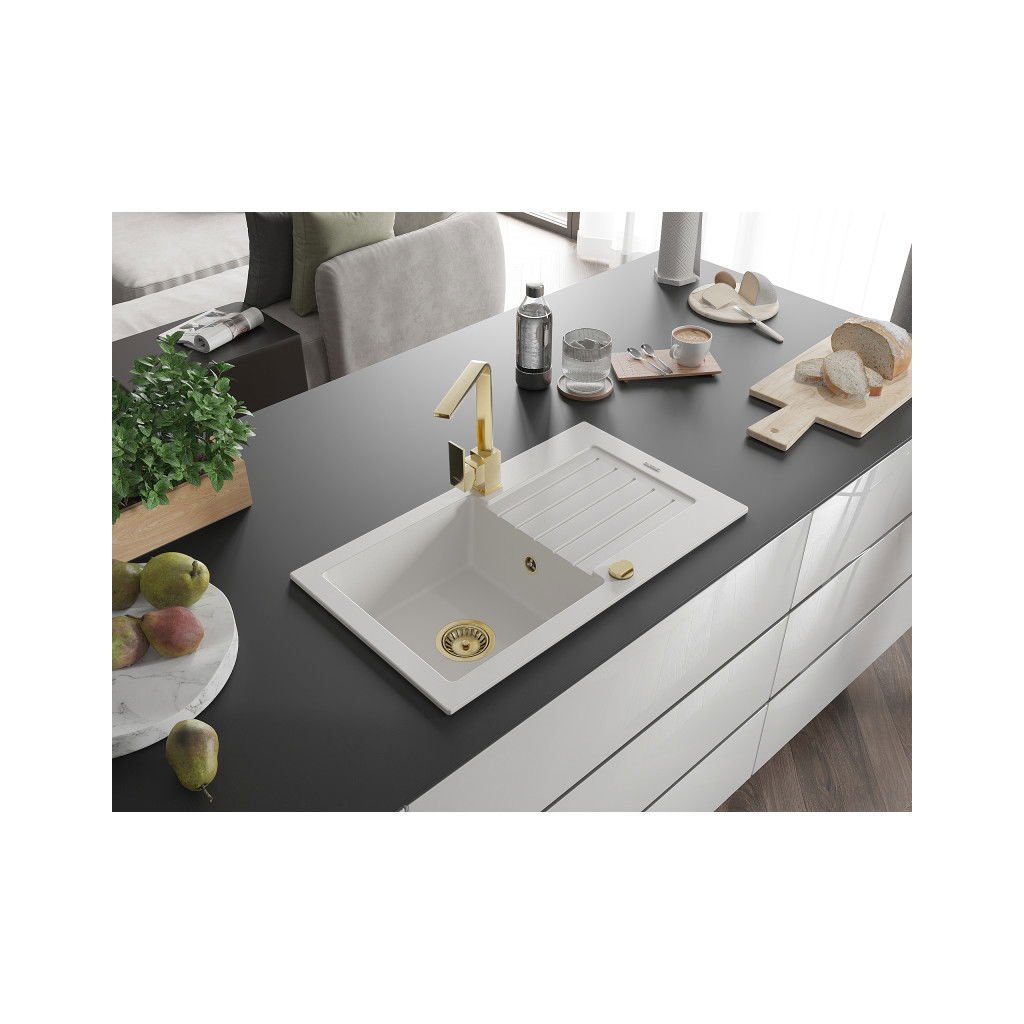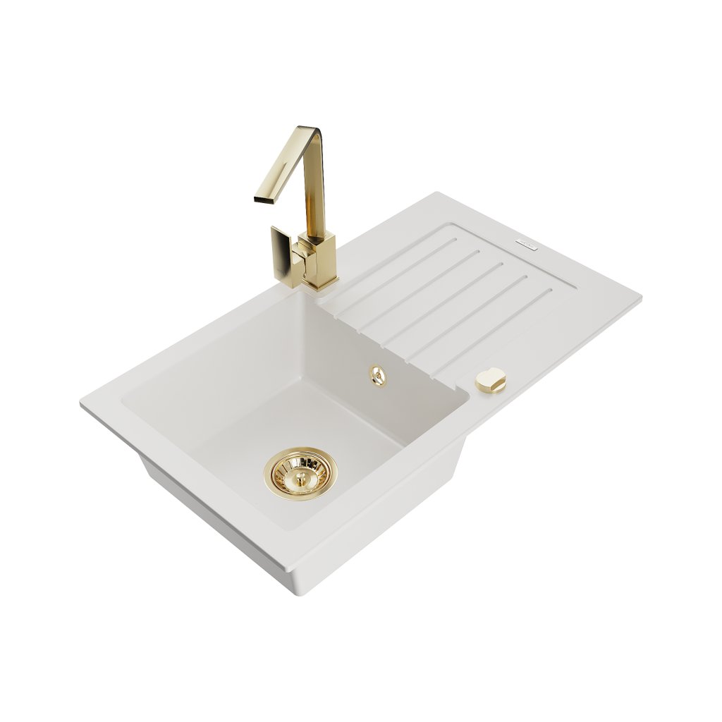 Mexen Pablo, granitový dřez 752x436x161 mm, 1-komorový a zlatá baterie Rita, bílá, 6510-20-670300-50